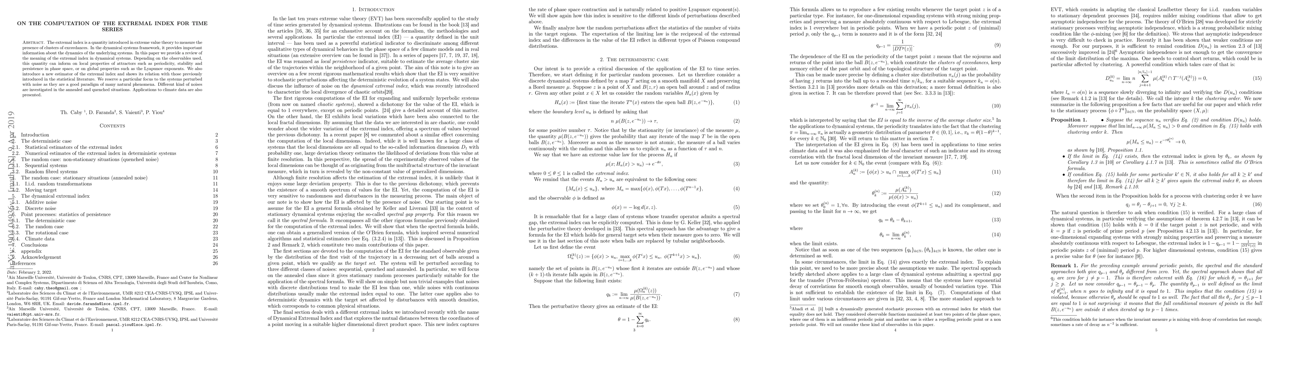 This paper reviews the extremal index in dynamical systems, highlighting its role in assessing both local and global properties, and introduces a new estimator. It focuses on the impact of noise on extremal index computation and applies the method to climate data, illustrating its relevance to natural phenomena.