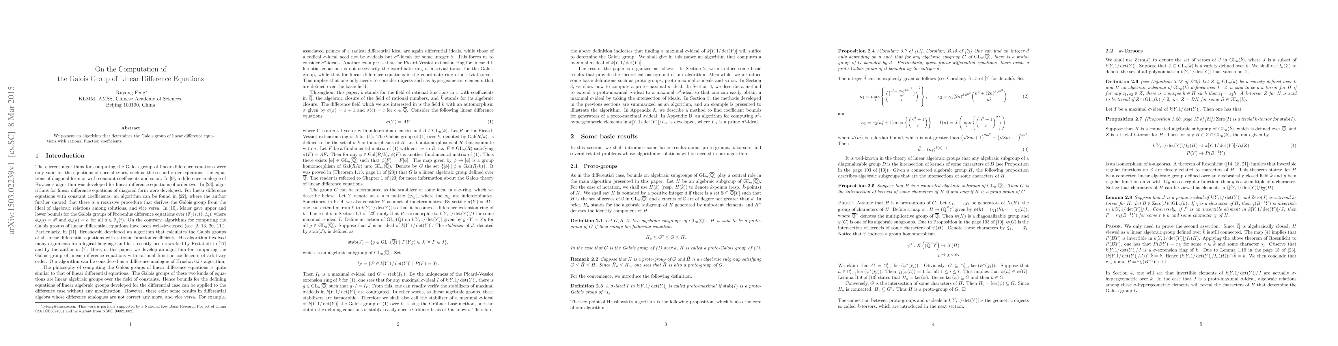 We present an algorithm that determines the Galois group of linear difference equations with rational function coefficients.