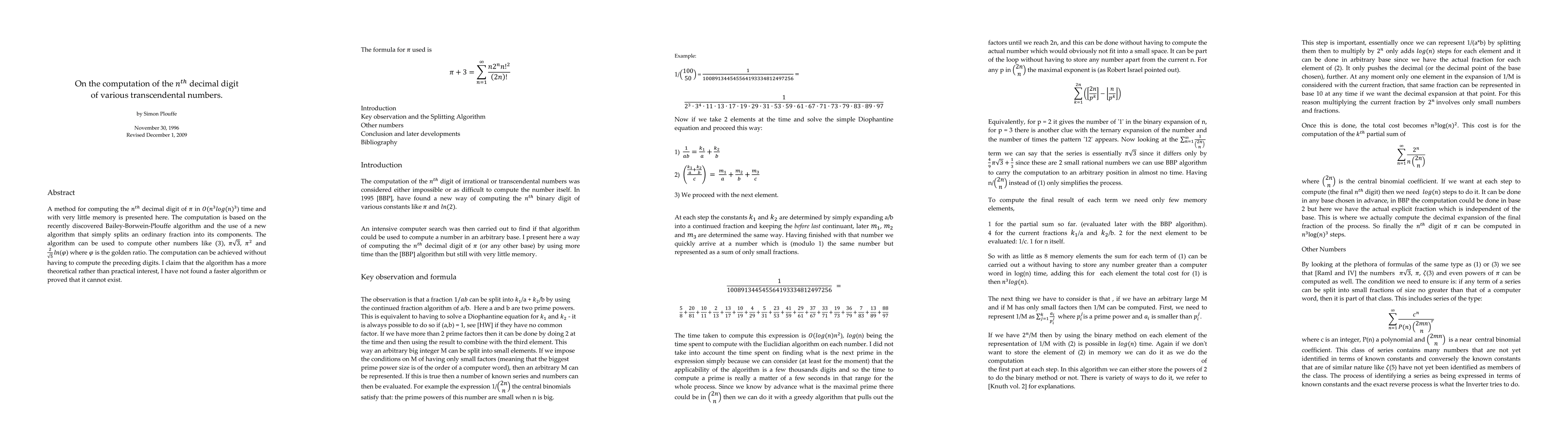A method for efficiently computing the nth decimal digit of various transcendental numbers like pi is presented, with an algorithm that runs in O(n^3 log(n)^3) time and uses minimal memory.