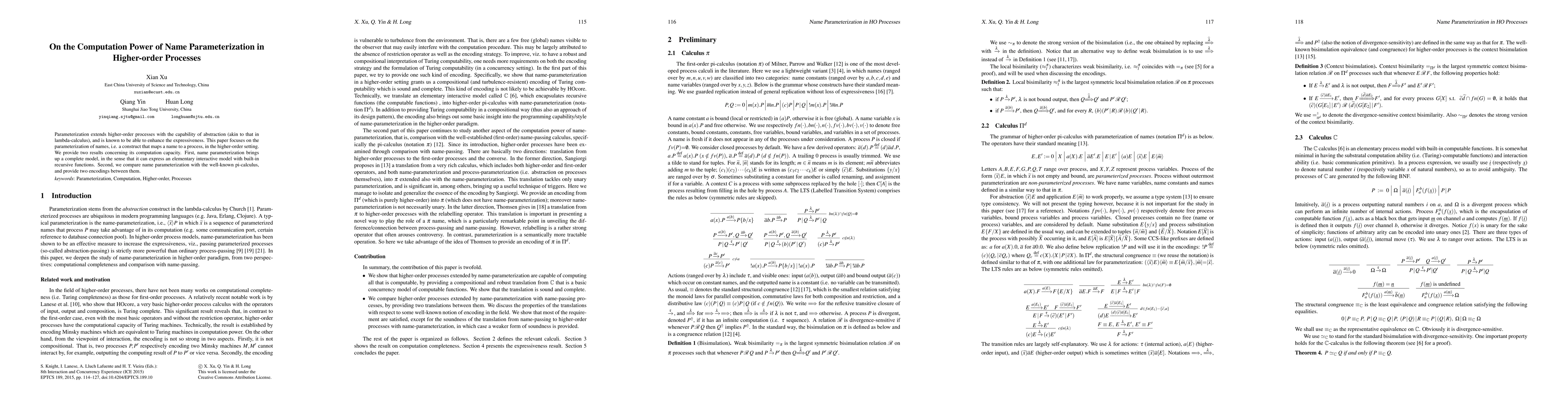 This paper explores the computation power of name parameterization in higher-order processes, demonstrating its ability to create a complete model with recursive functions. It also provides encodings between name parameterization and the pi-calculus, comparing their expressive capabilities.
