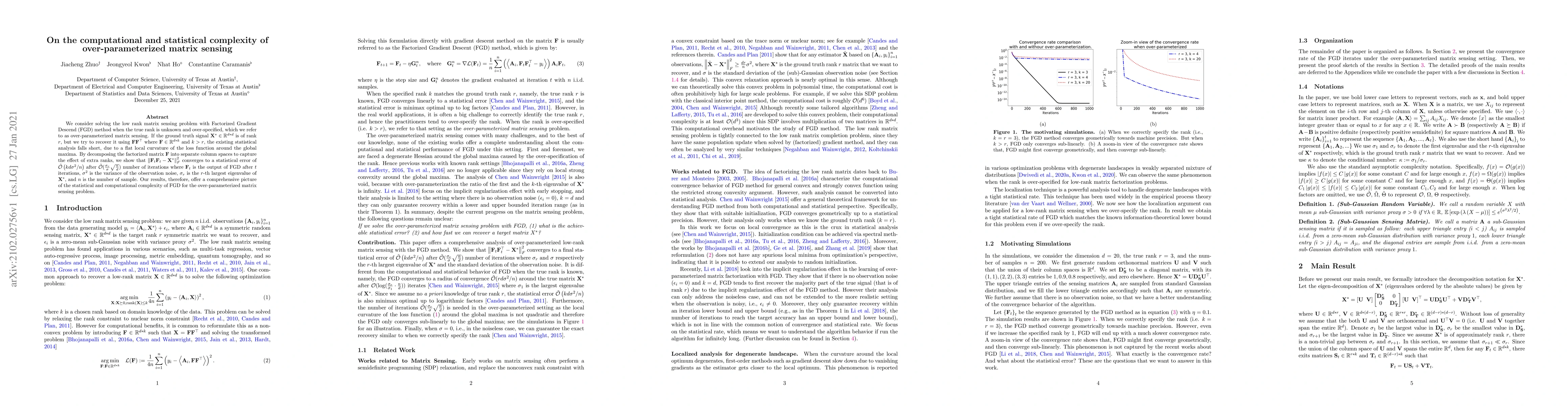 We consider solving the low rank matrix sensing problem with Factorized Gradient Descend (FGD) method when the true rank is unknown and over-specified, which we refer to as over-parameterized matrix sensing. If the ground truth signal $\mathbf{X}^* \in \mathbb{R}^{d*d}$ is of rank $r$, but we try to recover it using $\mathbf{F} \mathbf{F}^\top$ where $\mathbf{F} \in \mathbb{R}^{d*k}$ and $k>r$, the existing statistical analysis falls short, due to a flat local curvature of the loss function around the global maxima. By decomposing the factorized matrix $\mathbf{F}$ into separate column spaces to capture the effect of extra ranks, we show that $\|\mathbf{F}_t \mathbf{F}_t - \mathbf{X}^*\|_{F}^2$ converges to a statistical error of $\tilde{\mathcal{O}} ({k d \sigma^2/n})$ after $\tilde{\mathcal{O}}(\frac{\sigma_{r}}{\sigma}\sqrt{\frac{n}{d}})$ number of iterations where $\mathbf{F}_t$ is the output of FGD after $t$ iterations, $\sigma^2$ is the variance of the observation noise, $\sigma_{r}$ is the $r$-th largest eigenvalue of $\mathbf{X}^*$, and $n$ is the number of sample. Our results, therefore, offer a comprehensive picture of the statistical and computational complexity of FGD for the over-parameterized matrix sensing problem.