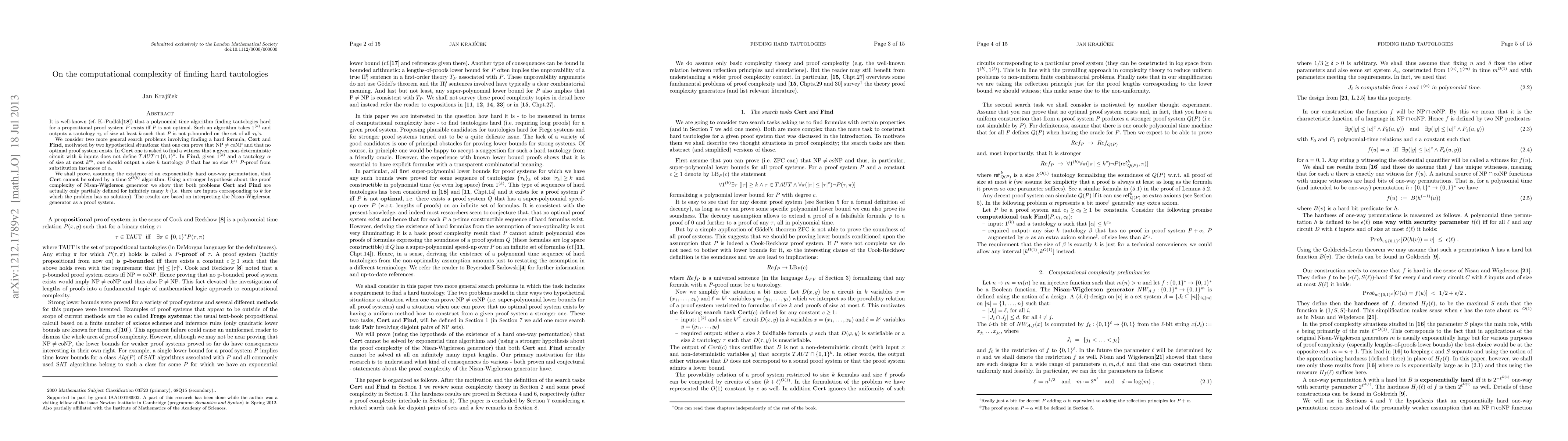 It is well-known (cf. K.-Pudl\'ak 1989) that a polynomial time algorithm finding tautologies hard for a propositional proof system $P$ exists iff $P$ is not optimal. Such an algorithm takes $1^{(k)}$ and outputs a tautology $\tau_k$ of size at least $k$ such that $P$ is not p-bounded on the set of all $\tau_k$'s. We consider two more general search problems involving finding a hard formula, {\bf Cert} and {\bf Find}, motivated by two hypothetical situations: that one can prove that $\np \neq co\np$ and that no optimal proof system exists. In {\bf Cert} one is asked to find a witness that a given non-deterministic circuit with $k$ inputs does not define $TAUT \cap \kk$. In {\bf Find}, given $1^{(k)}$ and a tautology $\alpha$ of size at most $k^{c_0}$, one should output a size $k$ tautology $\beta$ that has no size $k^{c_1}$ $P$-proof from substitution instances of $\alpha$. We shall prove, assuming the existence of an exponentially hard one-way permutation, that {\bf Cert} cannot be solved by a time $2^{O(k)}$ algorithm. Using a stronger hypothesis about the proof complexity of Nisan-Wigderson generator we show that both problems {\bf Cert} and {\bf Find} are actually only partially defined for infinitely many $k$ (i.e. there are inputs corresponding to $k$ for which the problem has no solution). The results are based on interpreting the Nisan-Wigderson generator as a proof system.