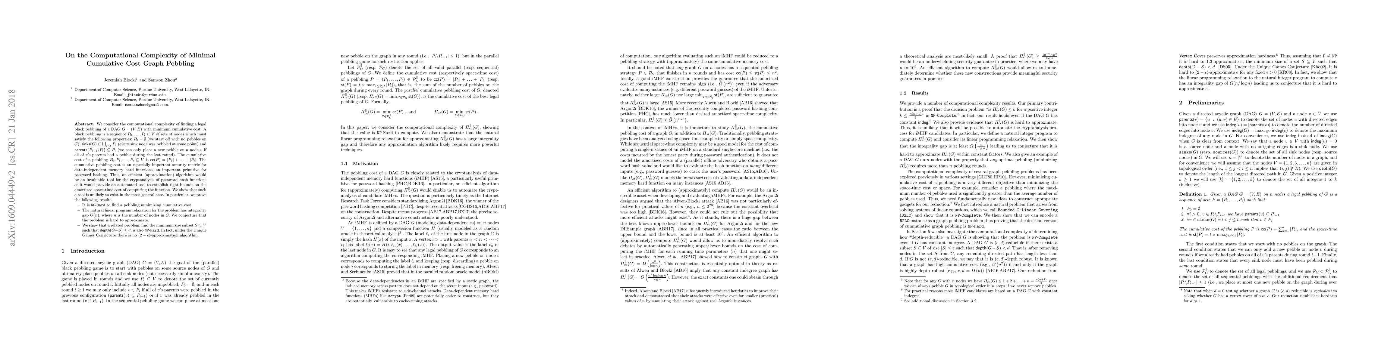 This paper investigates the computational complexity of finding a minimal cumulative cost black pebbling sequence in directed acyclic graphs (DAGs), which is crucial for assessing the security of memory-hard functions used in password hashing. The authors prove that minimizing cumulative cost is NP-hard and that a natural linear program relaxation has an integrality gap of $\tilde{O}(n)$. They also show that a related problem is NP-hard, suggesting that efficient approximation algorithms are unlikely to exist.