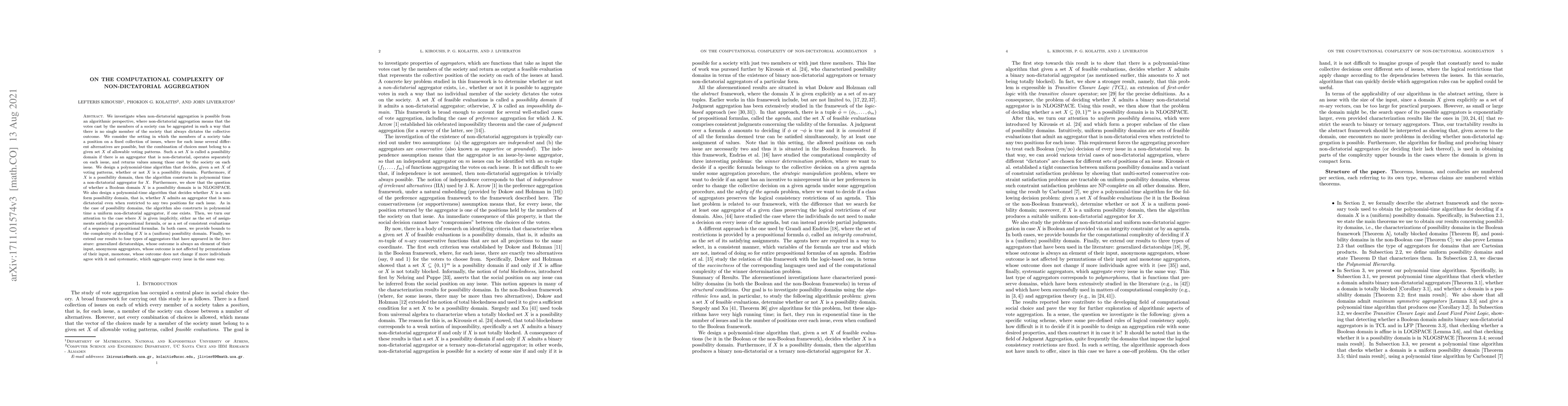 We investigate when non-dictatorial aggregation is possible from an algorithmic perspective, where non-dictatorial aggregation means that the votes cast by the members of a society can be aggregated in such a way that there is no single member of the society that always dictates the collective outcome. We consider the setting in which the members of a society take a position on a fixed collection of issues, where for each issue several different alternatives are possible, but the combination of choices must belong to a given set X of allowable voting patterns. Such a set X is called a possibility domain if there is an aggregator that is non-dictatorial, operates separately on each issue, and returns values among those cast by the society on each issue. We design a polynomial-time algorithm that decides, given a set X of voting patterns, whether or not X is a possibility domain. Furthermore, if X is a possibility domain, then the algorithm constructs in polynomial time a non-dictatorial aggregator for X. Furthermore, we show that the question of whether a Boolean domain X is a possibility domain is in NLOGSPACE. We also design a polynomial-time algorithm that decides whether X is a uniform possibility domain, that is, whether X admits an aggregator that is non-dictatorial even when restricted to any two positions for each issue. As in the case of possibility domains, the algorithm also constructs in polynomial time a uniform non-dictatorial aggregator, if one exists. Then, we turn our attention to the case where X is given implicitly, either as the set of assignments satisfying a propositional formula, or as a set of consistent evaluations of a sequence of propositional formulas. In both cases, we provide bounds to the complexity of deciding if X is a (uniform) possibility domain.