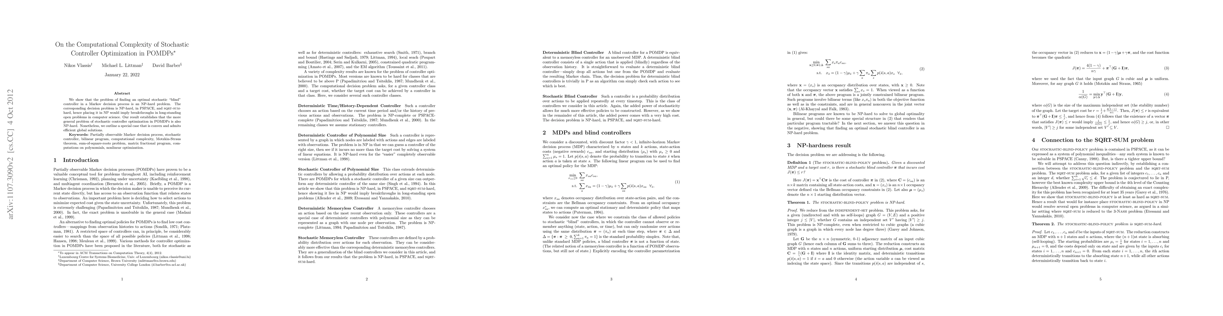 We show that the problem of finding an optimal stochastic 'blind' controller in a Markov decision process is an NP-hard problem. The corresponding decision problem is NP-hard, in PSPACE, and SQRT-SUM-hard, hence placing it in NP would imply breakthroughs in long-standing open problems in computer science. Our result establishes that the more general problem of stochastic controller optimization in POMDPs is also NP-hard. Nonetheless, we outline a special case that is convex and admits efficient global solutions.