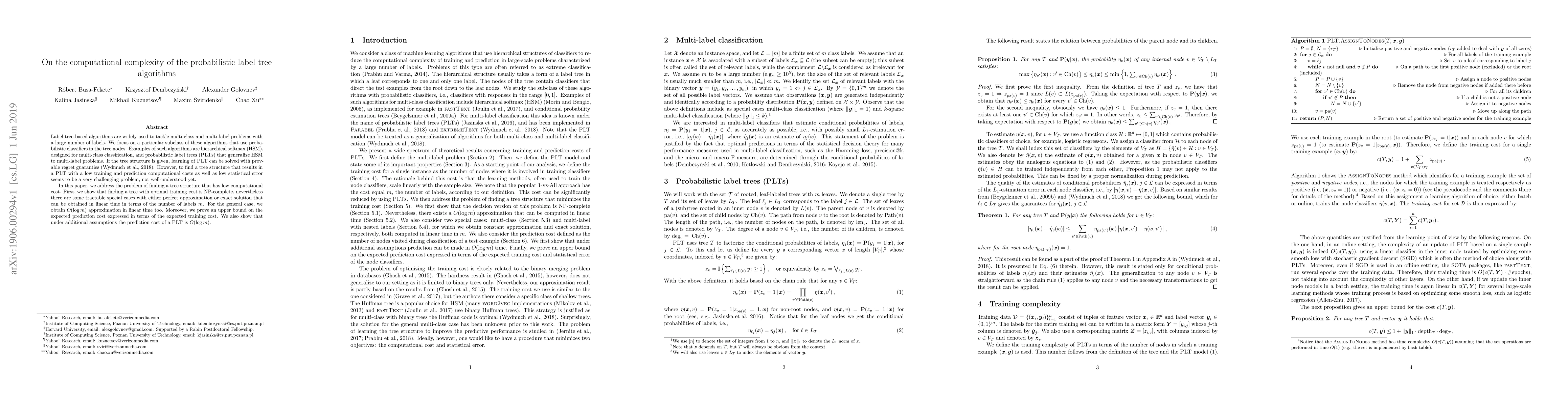 Label tree-based algorithms are widely used to tackle multi-class and multi-label problems with a large number of labels. We focus on a particular subclass of these algorithms that use probabilistic classifiers in the tree nodes. Examples of such algorithms are hierarchical softmax (HSM), designed for multi-class classification, and probabilistic label trees (PLTs) that generalize HSM to multi-label problems. If the tree structure is given, learning of PLT can be solved with provable regret guaranties [Wydmuch et.al. 2018]. However, to find a tree structure that results in a PLT with a low training and prediction computational costs as well as low statistical error seems to be a very challenging problem, not well-understood yet. In this paper, we address the problem of finding a tree structure that has low computational cost. First, we show that finding a tree with optimal training cost is NP-complete, nevertheless there are some tractable special cases with either perfect approximation or exact solution that can be obtained in linear time in terms of the number of labels $m$. For the general case, we obtain $O(\log m)$ approximation in linear time too. Moreover, we prove an upper bound on the expected prediction cost expressed in terms of the expected training cost. We also show that under additional assumptions the prediction cost of a PLT is $O(\log m)$.