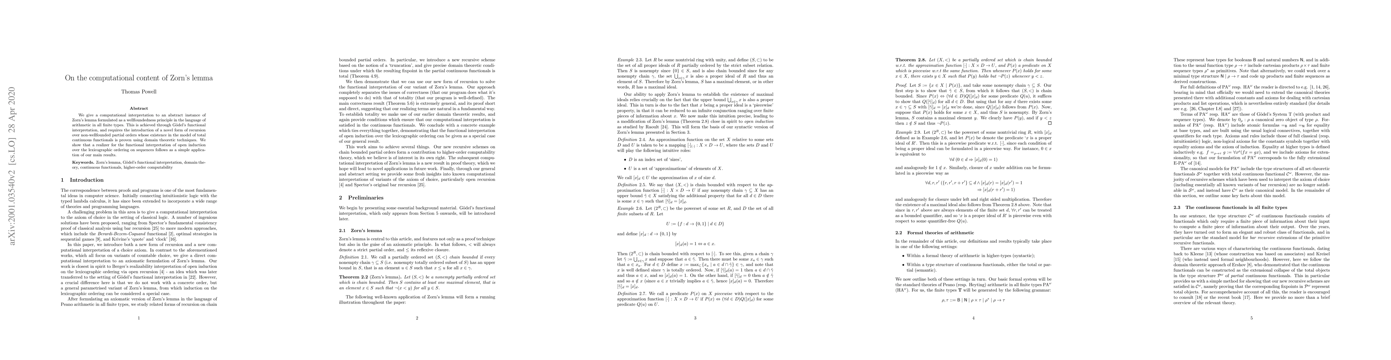 We give a computational interpretation to an abstract instance of Zorn's lemma formulated as a wellfoundedness principle in the language of arithmetic in all finite types. This is achieved through G\"odel's functional interpretation, and requires the introduction of a novel form of recursion over non-wellfounded partial orders whose existence in the model of total continuous functionals is proven using domain theoretic techniques. We show that a realizer for the functional interpretation of open induction over the lexicographic ordering on sequences follows as a simple application of our main results.