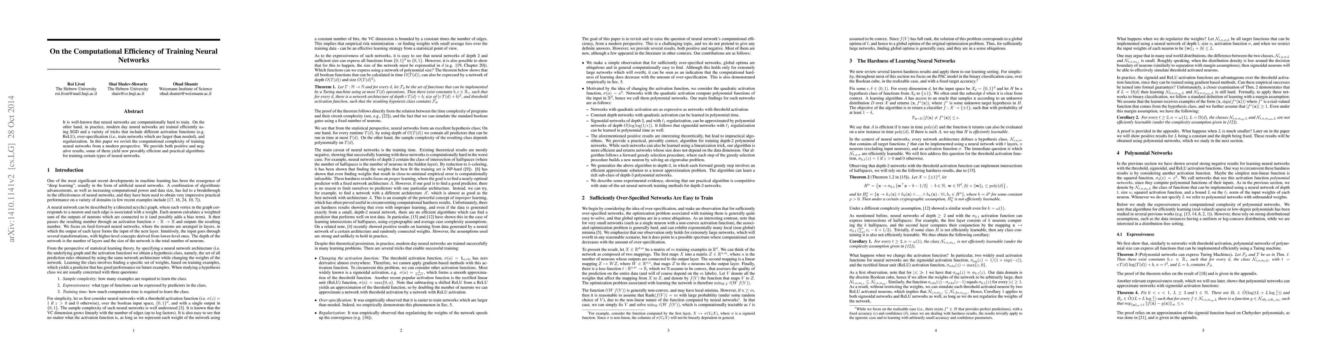 This paper examines the computational efficiency of training neural networks, highlighting modern techniques like SGD, activation functions, over-specification, and regularization. It presents both efficient algorithms and theoretical limitations, offering new insights into practical training methods.