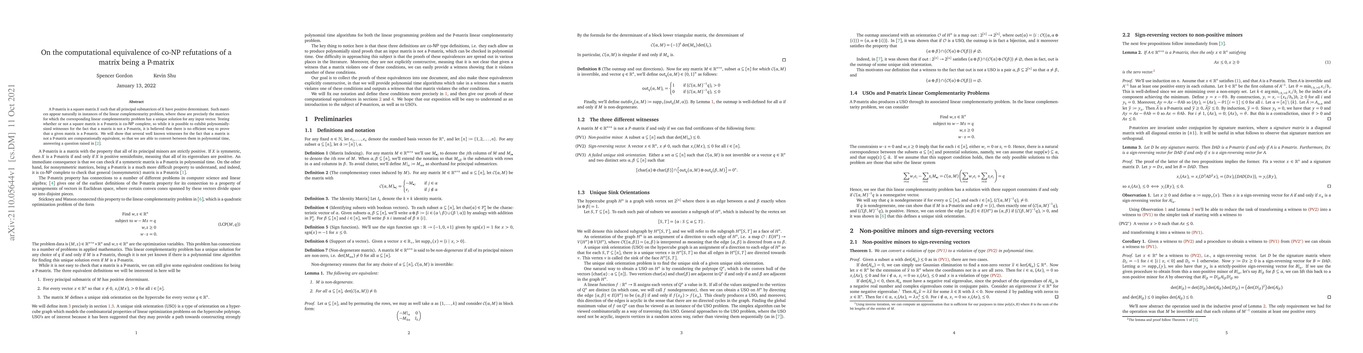 A P-matrix is a square matrix $X$ such that all principal submatrices of $X$ have positive determinant. Such matrices appear naturally in instances of the linear complementarity problem, where these are precisely the matrices for which the corresponding linear complementarity problem has a unique solution for any input vector. Testing whether or not a square matrix is a P-matrix is co-NP complete, so while it is possible to exhibit polynomially-sized witnesses for the fact that a matrix is not a P-matrix, it is believed that there is no efficient way to prove that a given matrix is a P-matrix. We will show that several well known witnesses for the fact that a matrix is not a P-matrix are computationally equivalent, so that we are able to convert between them in polynomial time, answering a question raised in arXiv:1811.03841 .