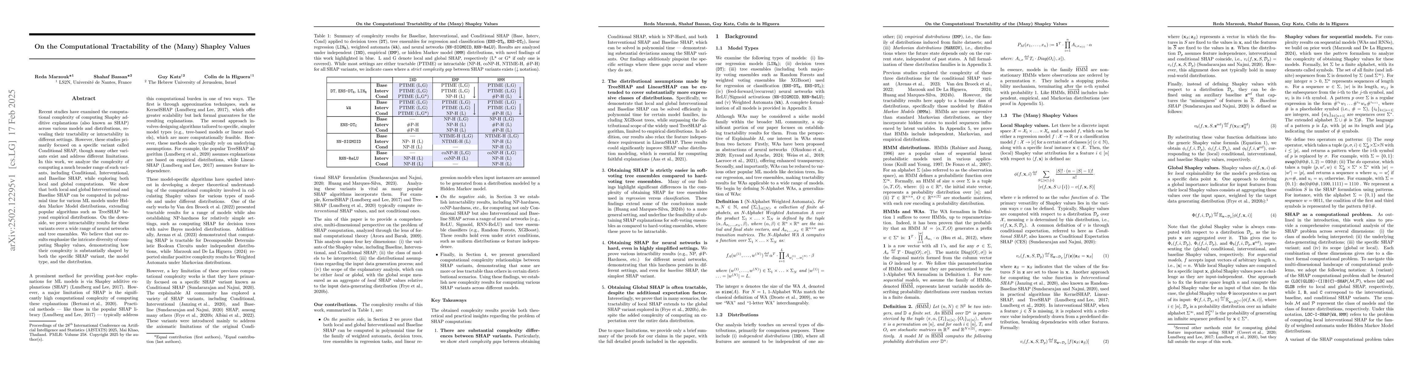 This paper investigates the computational complexity of various Shapley value variants, including Conditional, Interventional, and Baseline SHAP, across different machine learning models. It demonstrates polynomial-time computability for Interventional and Baseline SHAP under Hidden Markov Model distributions, while highlighting intractability for many neural networks and tree ensembles, underscoring the nuanced complexity shaped by SHAP variant, model type, and distribution.