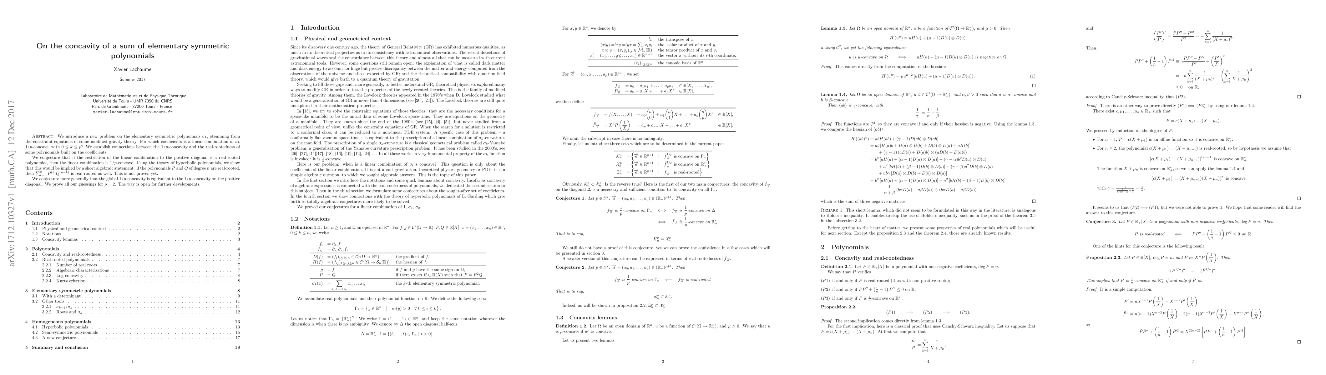 We introduce a new problem on the elementary symmetric polynomials $\sigma_k$, stemming from the constraint equations of some modified gravity theory. For which coefficients is a linear combination of $\sigma_k$ $1/p$-concave, with $0 \leq k \leq p$? We establish connections between the $1/p$-concavity and the real-rootedness of some polynomials built on the coefficients. We conjecture that if the restriction of the linear combination to the positive diagonal is a real-rooted polynomial, then the linear combination is $1/p$-concave. Using the theory of hyperbolic polynomials, we show that this would be implied by a short algebraic statement: if the polynomials $P$ and $Q$ of degree $n$ are real-rooted, then $\sum_{k=0}^n P^{(k)}Q^{(n-k)}$ is real-rooted as well. This is not proven yet. We conjecture more generally that the global $1/p$-concavity is equivalent to the $1/p$-concavity on the positive diagonal. We prove all our guessings for $p=2$. The way is open for further developments.