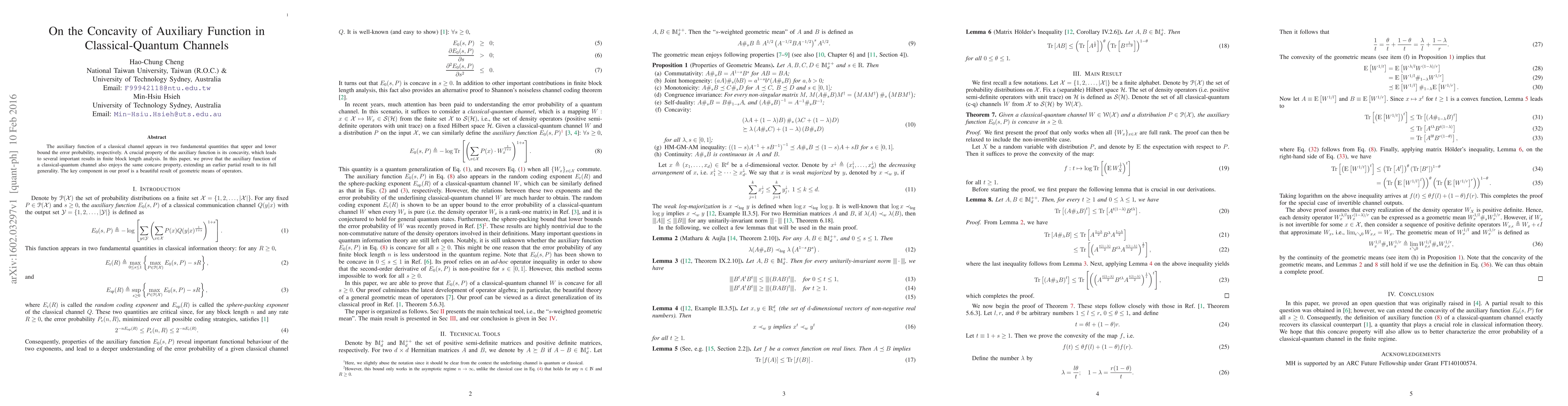 The auxiliary function of a classical channel appears in two fundamental quantities that upper and lower bound the error probability, respectively. A crucial property of the auxiliary function is its concavity, which leads to several important results in finite block length analysis. In this paper, we prove that the auxiliary function of a classical-quantum channel also enjoys the same concave property, extending an earlier partial result to its full generality. The key component in our proof is a beautiful result of geometric means of operators.