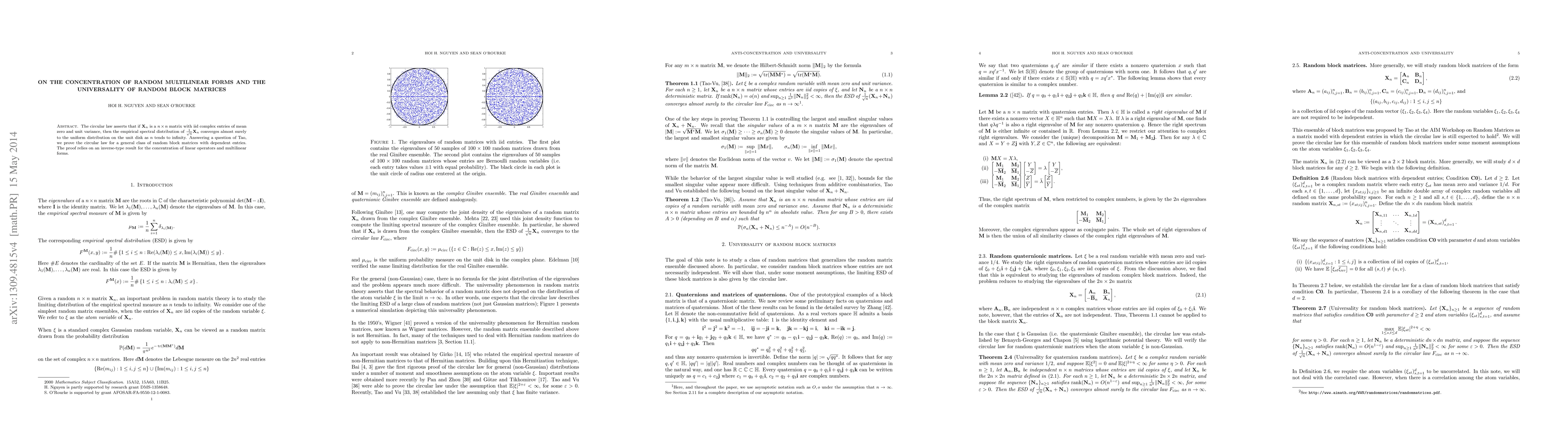 The circular law asserts that if $X_n$ is a $n \times n$ matrix with iid complex entries of mean zero and unit variance, then the empirical spectral distribution of $\frac{1}{\sqrt{n}} X_n$ converges almost surely to the uniform distribution on the unit disk as $n$ tends to infinity. Answering a question of Tao, we prove the circular law for a general class of random block matrices with dependent entries. The proof relies on an inverse-type result for the concentration of linear operators and multilinear forms.