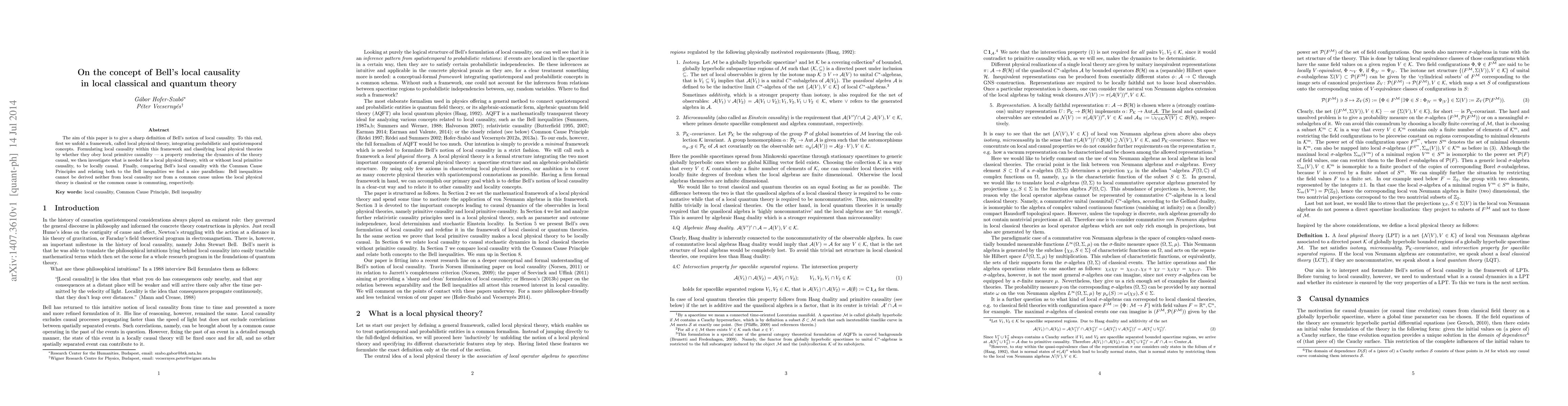 This paper defines Bell's local causality within a local physical theory framework, integrating probabilistic and spatiotemporal concepts. It explores the conditions under which local physical theories can be deemed locally causal, comparing these with the Common Cause Principles and Bell inequalities.