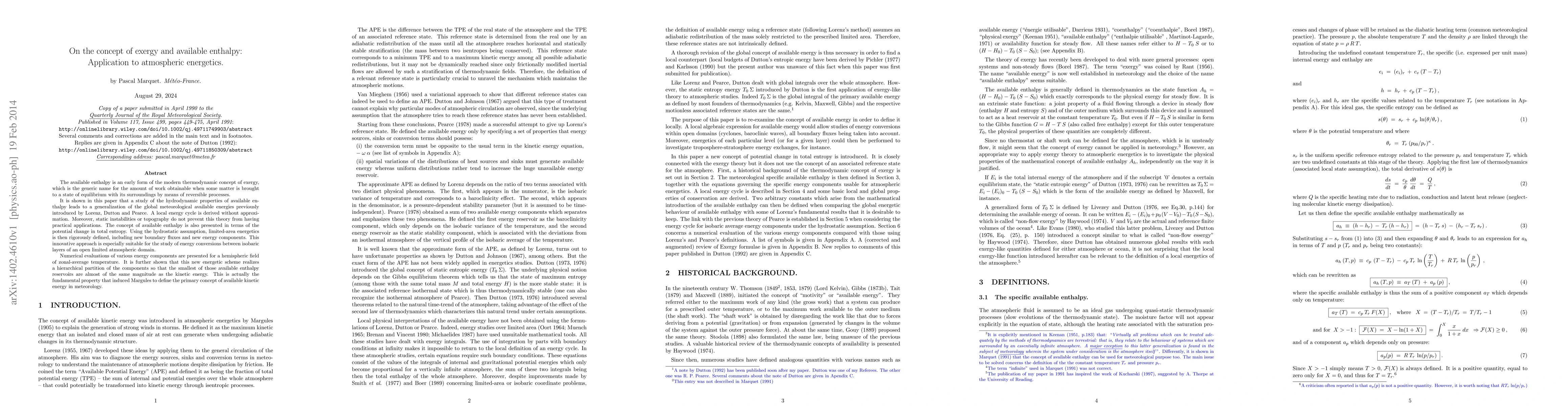 The available enthalpy is an early form of the modern thermodynamic concept of exergy, which is the generic name for the amount of work obtainable when some matter is brought to a state of equilibrium with its surroundings by means of reversible processes. It is shown in this paper that a study of the hydrodynamic properties of available enthalpy leads to a generalization of the global meteorological available energies previously introduced by Lorenz, Dutton and Pearce. A local energy cycle is derived without approximation. Moreover, static instabilities or topography do not prevent this theory from having practical applications. The concept of available enthalpy is also presented in terms of the potential change in total entropy. Using the hydrostatic assumption, limited-area energetics is then rigorously defined, including new boundary fluxes and new energy components. This innovative approach is especially suitable for the study of energy conversions between isobaric layers of an open limited atmospheric domain. Numerical evaluations of various energy components are presented for a hemispheric field of zonal-average temperature. It is further shown that this new energetic scheme realizes a hierarchical partition of the components so that the smallest of those available enthalpy reservoirs are almost of the same magnitude as the kinetic energy. This is actually the fundamental property that induced Margules to define the primary concept of available kinetic energy in meteorology.