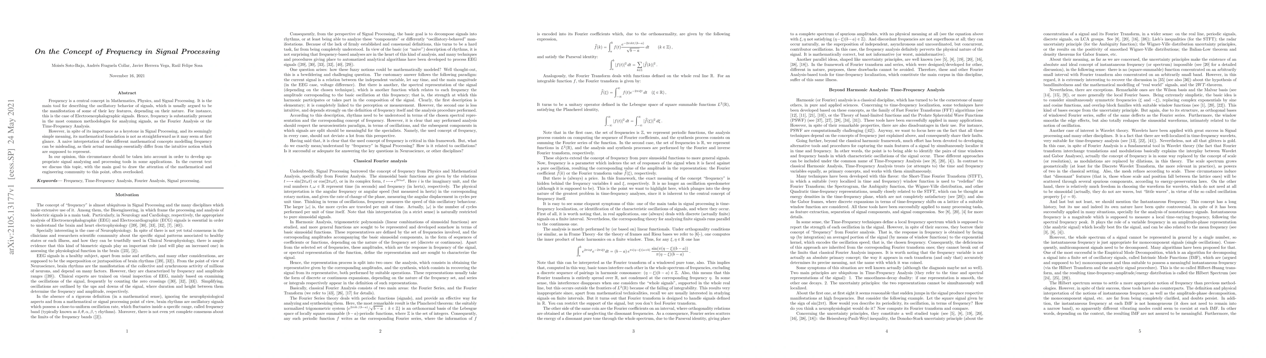 Frequency is a central concept in Mathematics, Physics, and Signal Processing. It is the main tool for describing the oscillatory behavior of signals, which is usually argued to be the manifestation of some of their key features, depending on their nature. For instance, this is the case of Electroencephalographic signals. Hence, frequency is substantially present in the most common methodologies for analyzing signals, as the Fourier Analysis or the Time-Frequency Analysis. However, in spite of its importance as a keystone in Signal Processing, and its seemingly simple meaning, its mathematical foundation is not as straightforward as it may seem at first glance. A naive interpretation of the different mathematical concepts modelling frequency can be misleading, as their actual meanings essentially differ from the intuitive notion which are supposed to represent. In our opinion, this circumstance should be taken into account in order to develop appropriate signal analyzing and processing tools in some applications. In the current text we discuss this topic, with the main goal to draw the attention of the mathematical and engineering community to this point,often overlooked.