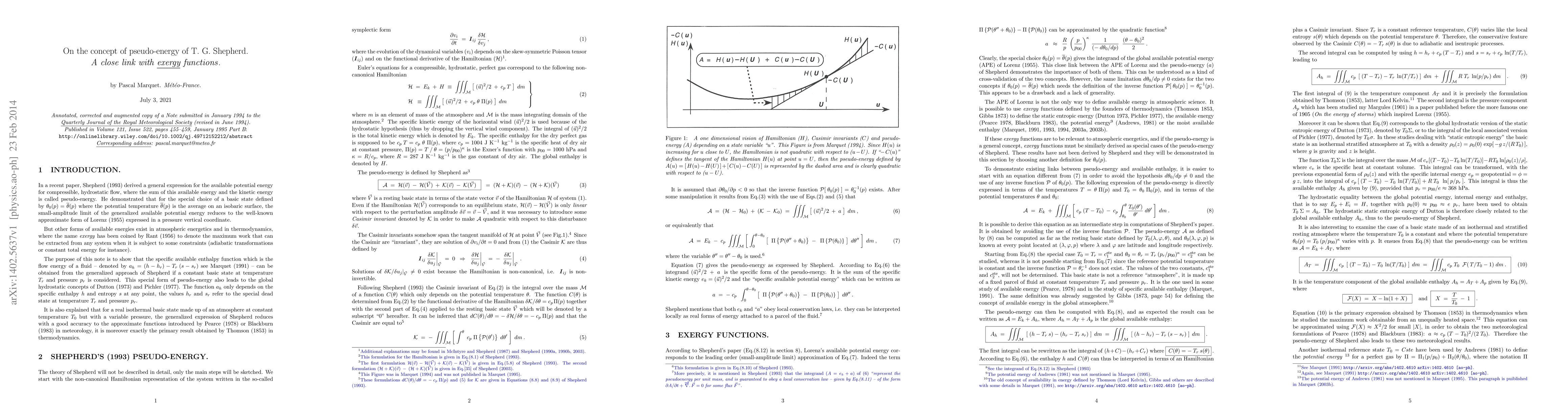 Shepherd (1993) derived a general expression for the available potential energy for compressible, hydrostatic flow, where the sum of this available energy and the kinetic energy is called pseudo-energy. He demonstrated that for a special basic state the small-amplitude limit of the generalized available potential energy reduces to the well-known approximate form of Lorenz (1955) expressed in a pressure vertical coordinate. Other forms of available energies exist in atmospheric energetics and in thermodynamics, where the name exergy has been coined by Rant (1956) to denote the maximum work that can be extracted from any system when it is subject to some constraints (adiabatic transformations or constant total energy for instance). The purpose of this note is to show that the specific available enthalpy function denoted by $a_h = (h - h_r) - T_r \: (s - s_r)$ in Marquet (1991) can be obtained from the generalized approach of Shepherd for another basic state. This special form of pseudo-energy also leads to the global hydrostatic concepts of Dutton (1973) and Pichler (1977). The function $a_h$ only depends on the specific enthalpy $h$ and entropy $s$ at any point, the values $h_r$ and $s_r$ refer to the special dead state at temperature $T_r$ and pressure $p_r$. It is explained that for another choice of the basic state, the generalized expression of Shepherd reduces with a good accuracy to the approximate functions introduced by Pearce (1978) or Blackburn (1983) in meteorology and Thomson (1853, Lord Kelvin) in thermodynamics.
