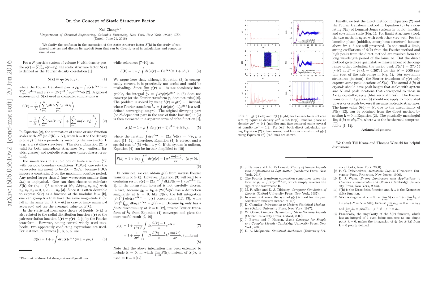 We clarify the confusion in the expression of the static structure factor S(k) in the study of condensed matters and discuss its explicit form that can be directly used in calculations and computer simulations.