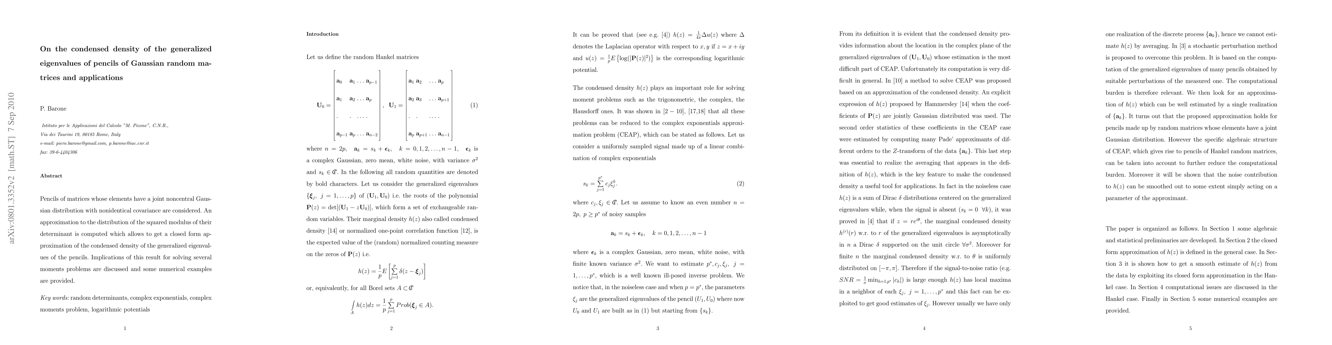 Pencils of Hankel matrices whose elements have a joint Gaussian distribution with nonzero mean and not identical covariance are considered. An approximation to the distribution of the squared modulus of their determinant is computed which allows to get a closed form approximation of the condensed density of the generalized eigenvalues of the pencils. Implications of this result for solving several moments problems are discussed and some numerical examples are provided.