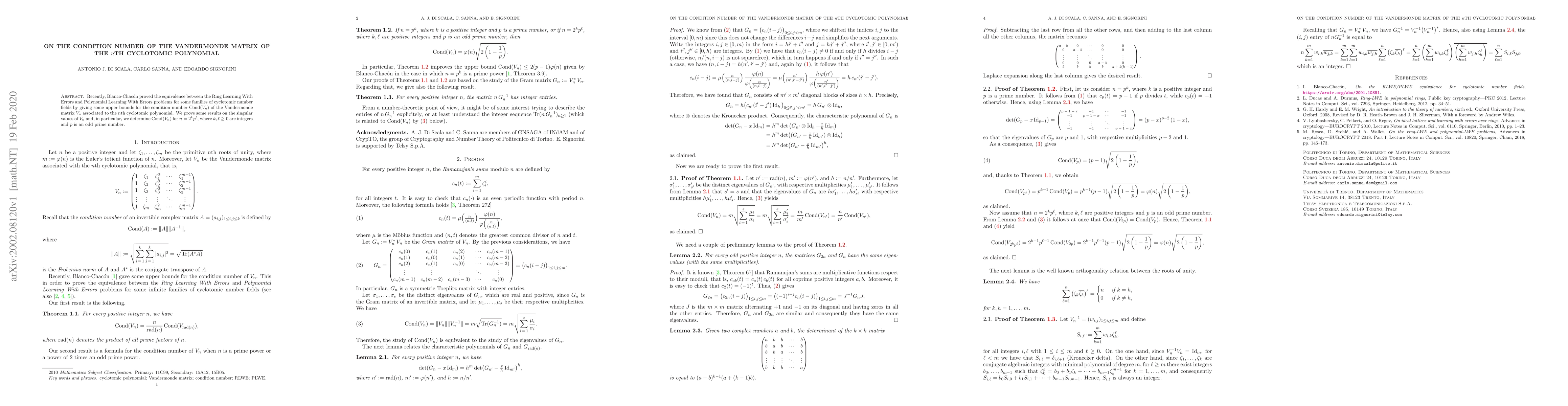 Recently, Blanco-Chac\'on proved the equivalence between the Ring Learning With Errors and Polynomial Learning With Errors problems for some families of cyclotomic number fields by giving some upper bounds for the condition number $\operatorname{Cond}(V_n)$ of the Vandermonde matrix $V_n$ associated to the $n$th cyclotomic polynomial. We prove some results on the singular values of $V_n$ and, in particular, we determine $\operatorname{Cond}(V_n)$ for $n = 2^k p^\ell$, where $k, \ell \geq 0$ are integers and $p$ is an odd prime number.