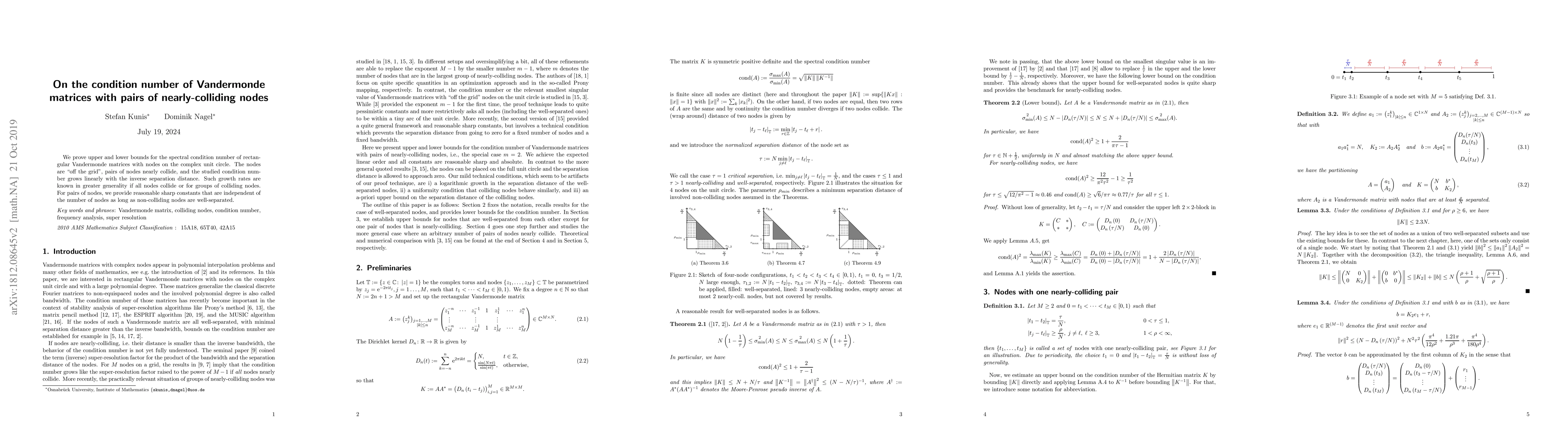 We prove upper and lower bounds for the spectral condition number of rectangular Vandermonde matrices with nodes on the complex unit circle. The nodes are "off the grid", pairs of nodes nearly collide, and the studied condition number grows linearly with the inverse separation distance. Such growth rates are known in greater generality if all nodes collide or for groups of colliding nodes. For pairs of nodes, we provide reasonable sharp constants that are independent of the number of nodes as long as non-colliding nodes are well-separated.