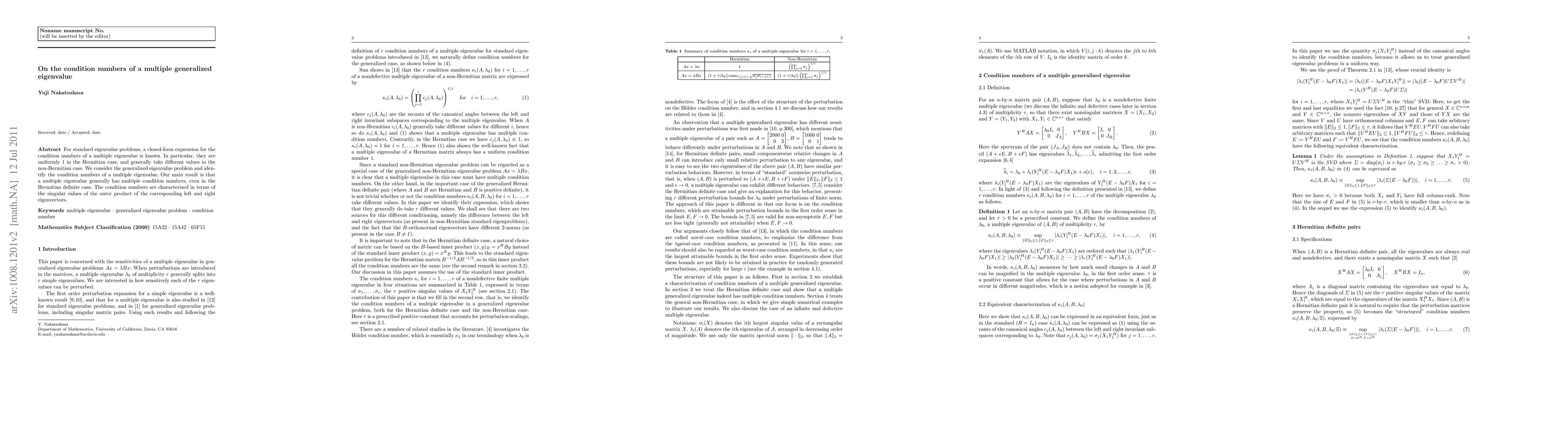 This paper investigates the condition numbers for multiple generalized eigenvalues in both Hermitian and non-Hermitian cases. It finds that multiple eigenvalues generally have distinct condition numbers, characterized by the singular values of the outer product of their corresponding left and right eigenvectors.