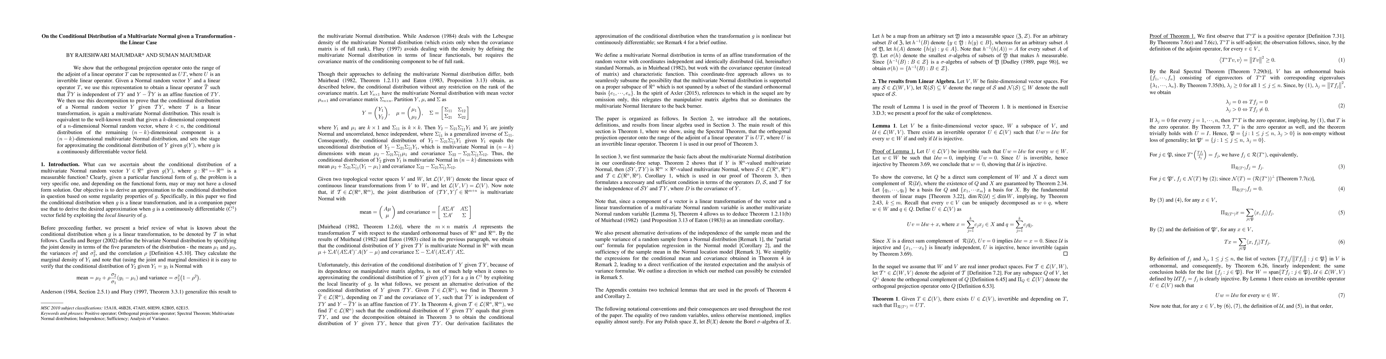 This paper demonstrates that the conditional distribution of a multivariate Normal vector given a linear transformation is itself a multivariate Normal distribution, using a decomposition technique involving orthogonal projection operators and linear transformations. This result extends to approximating conditional distributions for more general transformations.