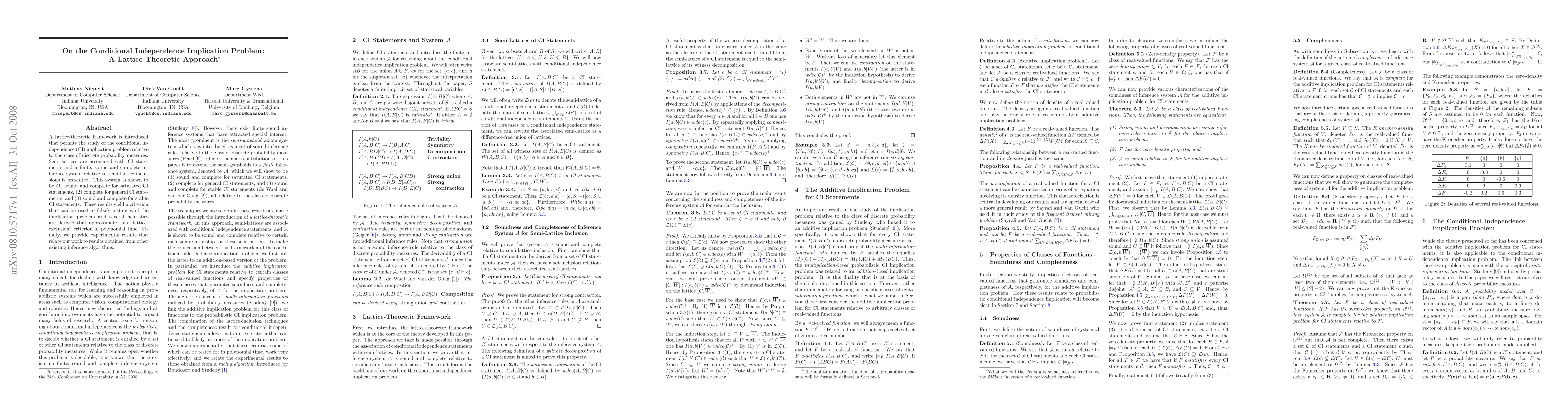This paper introduces a lattice-theoretic framework to study conditional independence implication problems for discrete probability measures, presenting a sound and complete inference system for various CI statements. Experimental results compare the proposed method with existing algorithms.