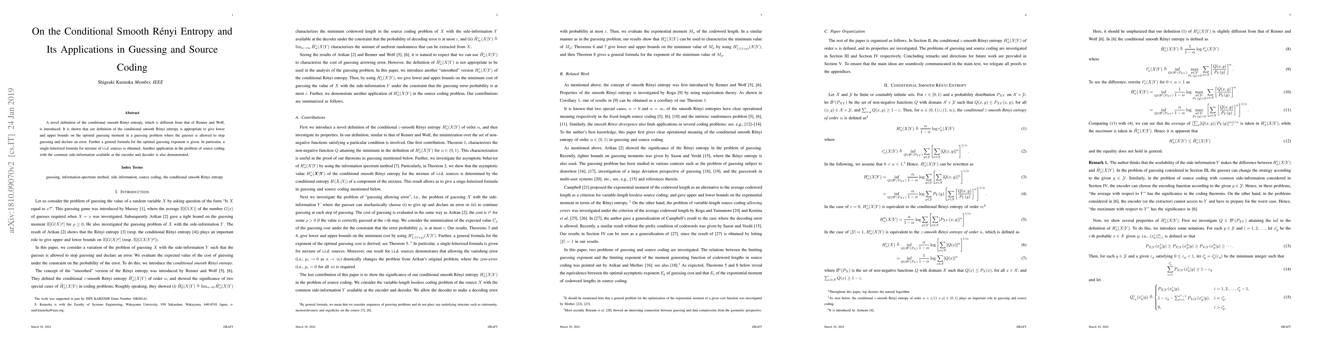 This paper introduces a new definition of conditional smooth Renyi entropy, demonstrating its utility in providing bounds for optimal guessing moments in guessing problems and in source coding scenarios with shared side information. It also presents a general formula for the optimal guessing exponent and a single-letter formula for i.i.d. source mixtures.