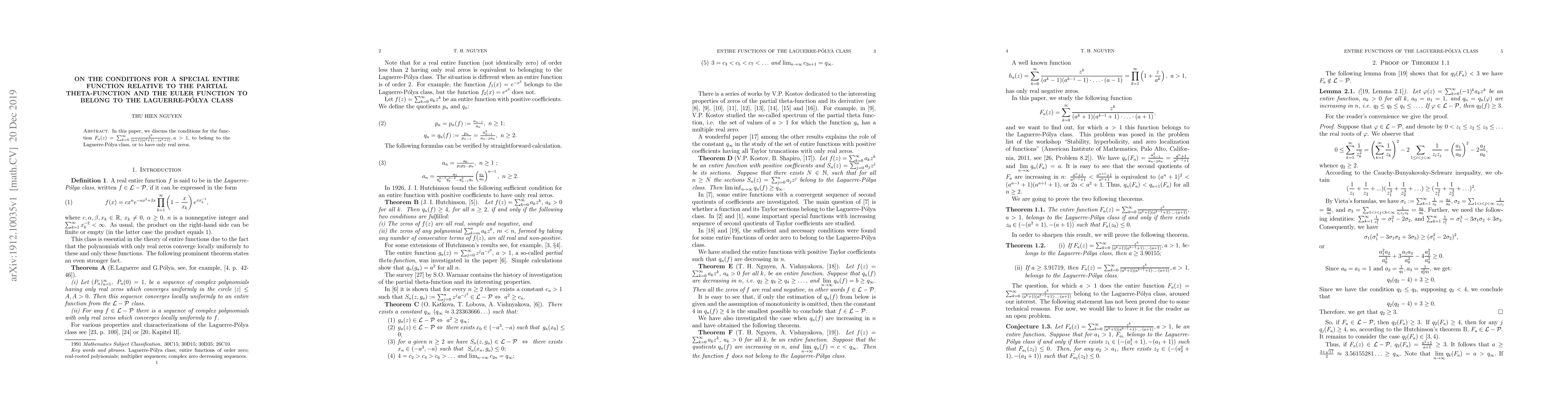In this paper, we discuss the conditions for the function $F_a(z) = \sum_{k=0}^\infty \frac{z^k}{(a+1)(a^2+1) \ldots (a^k+1)}, a>1,$ to belong to the Laguerre-P\'olya class, or to have only real zeros.