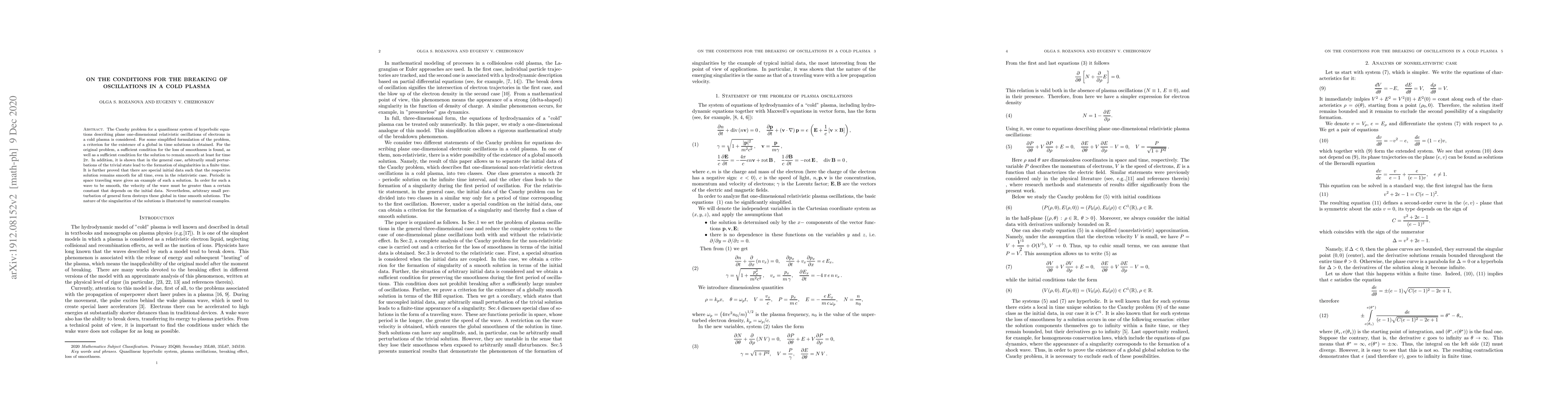 This paper investigates the conditions under which oscillations in a cold plasma break, focusing on the loss of smoothness in solutions to a quasilinear system of hyperbolic equations. It finds sufficient conditions for both the formation of singularities and the preservation of smoothness, and provides numerical examples to illustrate the nature of these singularities.