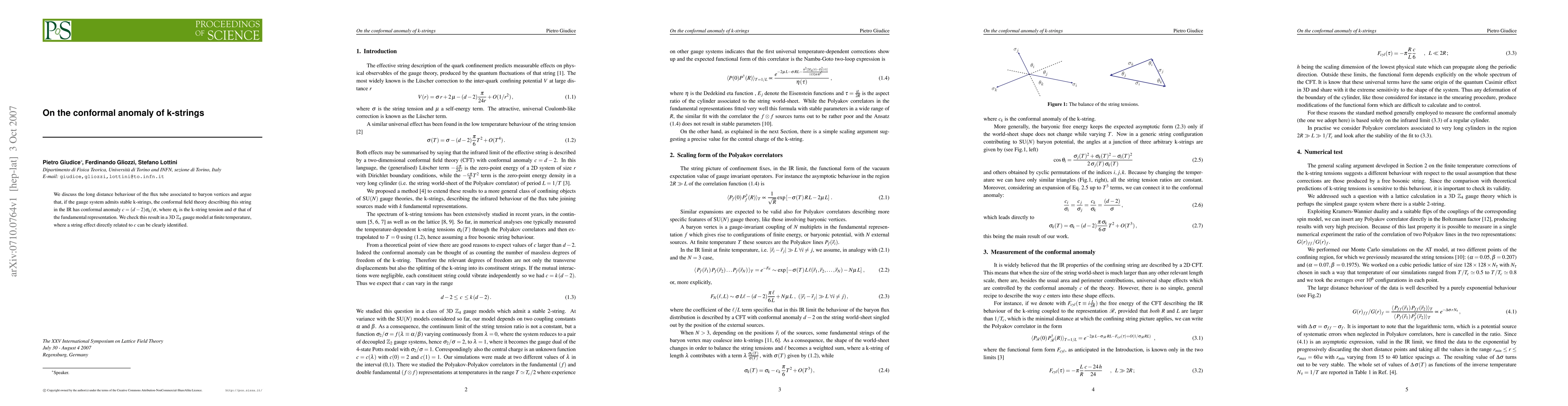 This paper explores the conformal anomaly in a gauge system with stable k-strings, showing that the associated conformal field theory exhibits a conformal anomaly proportional to (d-2)σ_k/σ, where σ_k is the k-string tension and σ the fundamental representation tension. The result is verified in a 3D Z_4 gauge model at finite temperature.