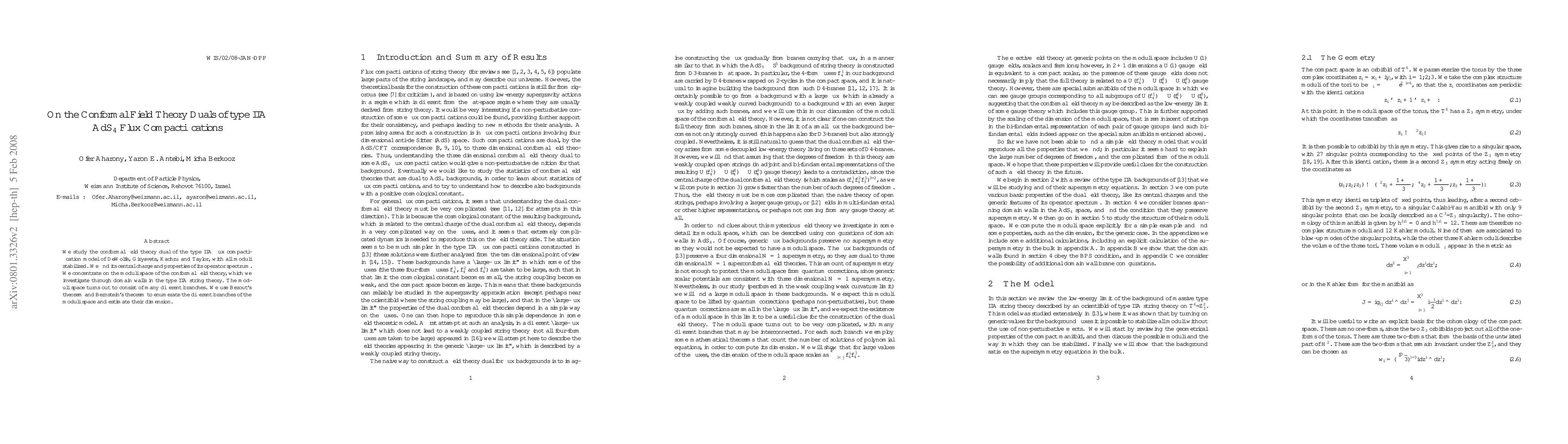 We study the conformal field theory dual of the type IIA flux compactification model of DeWolfe, Giryavets, Kachru and Taylor, with all moduli stabilized. We find its central charge and properties of its operator spectrum. We concentrate on the moduli space of the conformal field theory, which we investigate through domain walls in the type IIA string theory. The moduli space turns out to consist of many different branches. We use Bezout's theorem and Bernstein's theorem to enumerate the different branches of the moduli space and estimate their dimension.