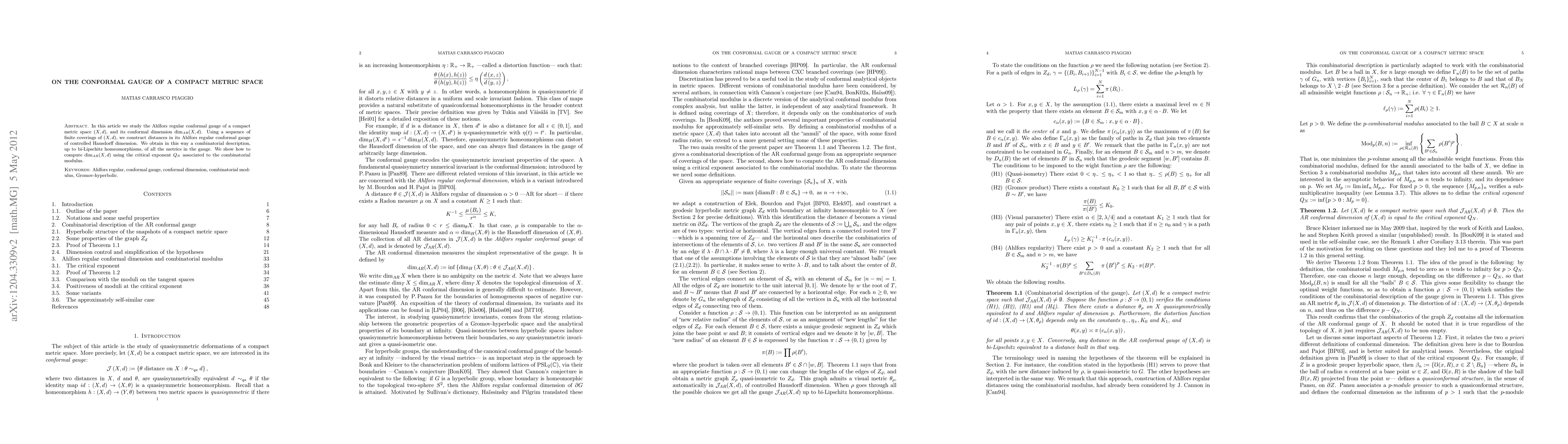 In this article we study the Ahlfors regular conformal gauge of a compact metric space $(X,d)$, and its conformal dimension $\mathrm{dim}_{AR}(X,d)$. Using a sequence of finite coverings of $(X,d)$, we construct distances in its Ahlfors regular conformal gauge of controlled Hausdorff dimension. We obtain in this way a combinatorial description, up to bi-Lipschitz homeomorphisms, of all the metrics in the gauge. We show how to compute $\mathrm{dim}_{AR}(X,d)$ using the critical exponent $Q_N$ associated to the combinatorial modulus.