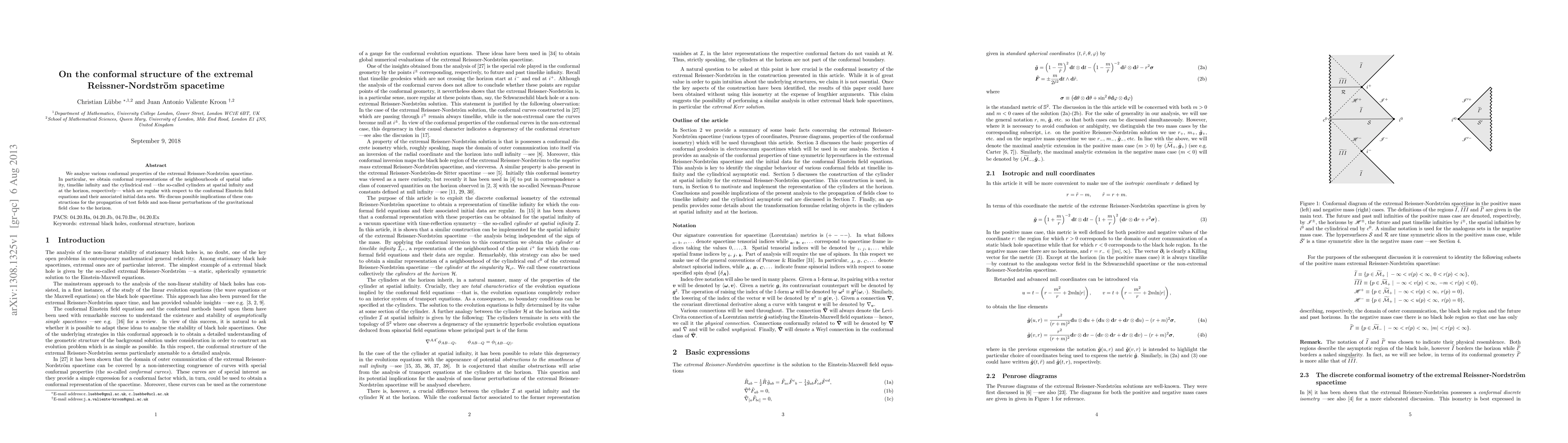 This paper investigates the conformal properties of the extremal Reissner-Nordström spacetime, focusing on regular conformal representations of spatial and temporal infinities and the horizon. The study discusses potential implications for test fields and gravitational perturbations near the horizon.