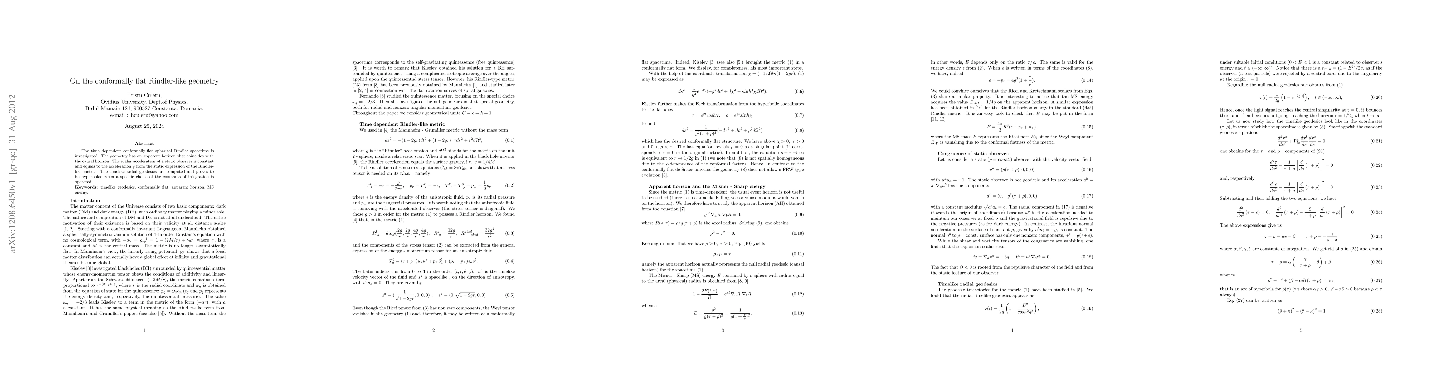 This paper investigates the conformally-flat spherical Rindler spacetime, revealing an apparent horizon that aligns with the causal horizon. It finds that the scalar acceleration for a static observer remains constant and equals the acceleration $g$ from the Rindler-like metric, while timelike radial geodesics are shown to be hyperbolic under specific integration conditions.