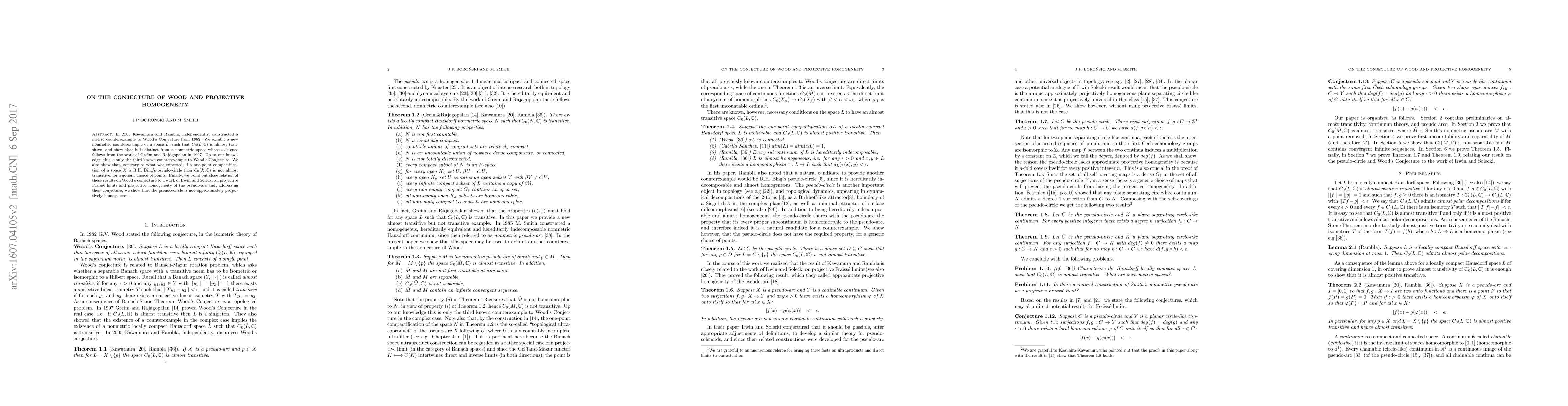 In 2005 Kawamura and Rambla, independently, constructed a metric counterexample to Wood's Conjecture from 1982. We exhibit a new nonmetric counterexample of a space $\hat L$, such that $C_0(\hat L,\mathbb{C})$ is almost transitive, and show that it is distinct from a nonmetric space whose existence follows from the work of Greim and Rajagopalan in 1997. Up to our knowledge, this is only the third known counterexample to Wood's Conjecture. We also show that, contrary to what was expected, if a one-point compactification of a space $X$ is R.H. Bing's pseudo-circle then $C_0(X,\mathbb{C})$ is not almost transitive, for a generic choice of points. Finally, we point out close relation of these results on Wood's conjecture to a work of Irwin and Solecki on projective Fra\"iss\'e limits and projective homogeneity of the pseudo-arc and, addressing their conjecture, we show that the pseudo-circle is not approximately projectively homogeneous.
