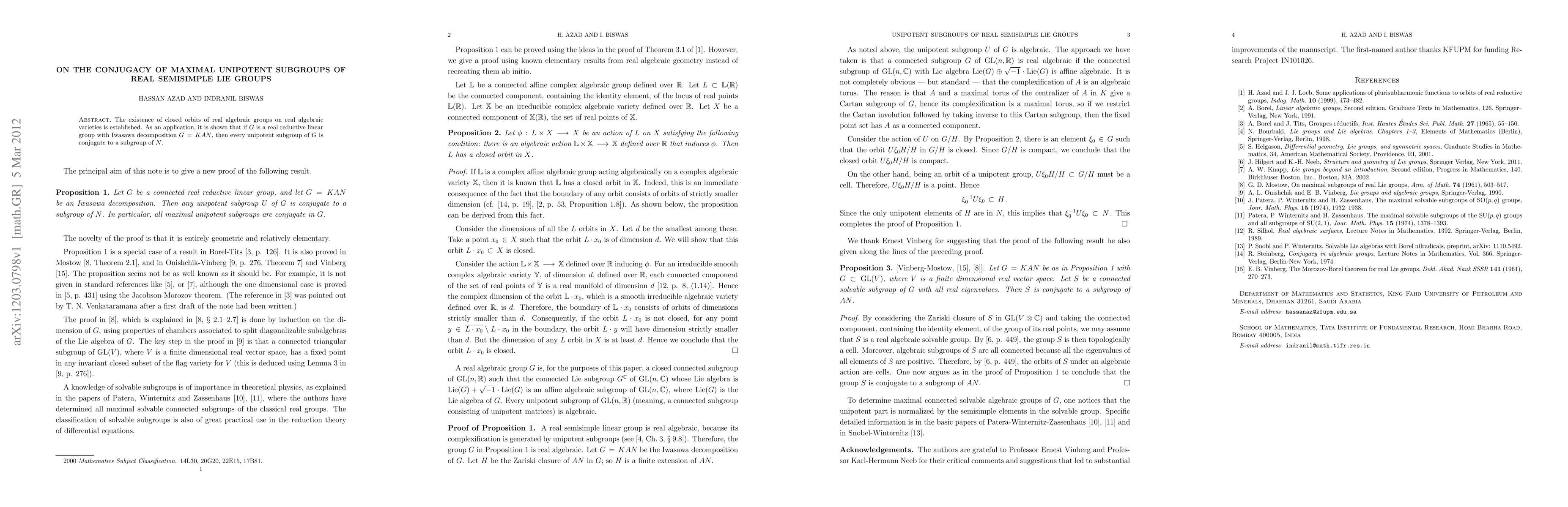 The existence of closed orbits of real algebraic groups on real algebraic varieties is established. As an application, it is shown that if G is a real reductive linear group with Iwasawa decomposition G= KAN, then every unipotent subgroup of G is conjugate to a subgroup of N.