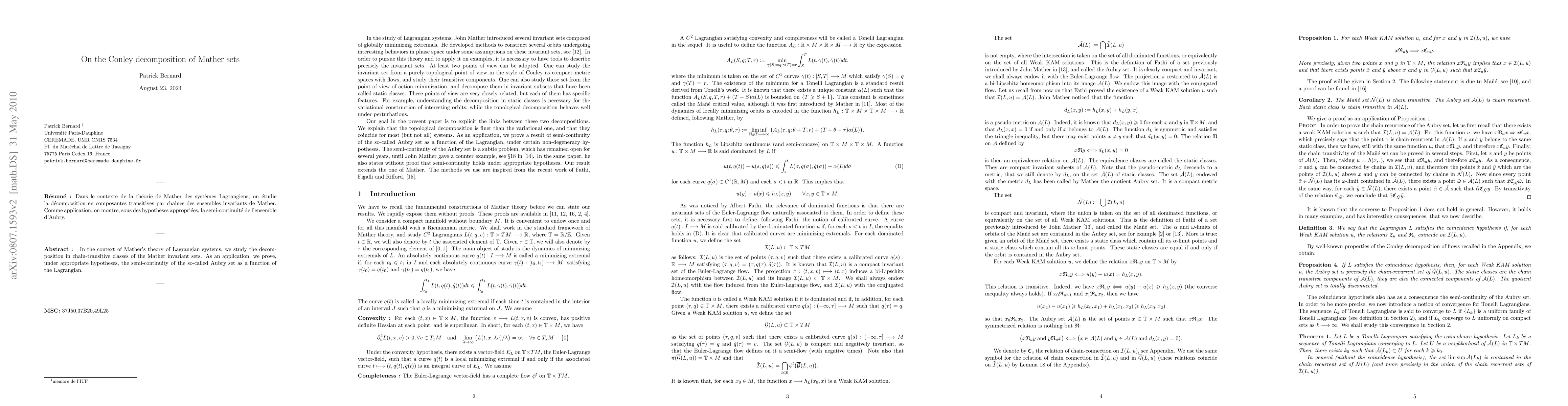 This paper explores the decomposition of Mather sets into chain-transitive classes within the framework of Lagrangian systems, and demonstrates the semi-continuity of the Aubry set with respect to the Lagrangian under certain conditions.