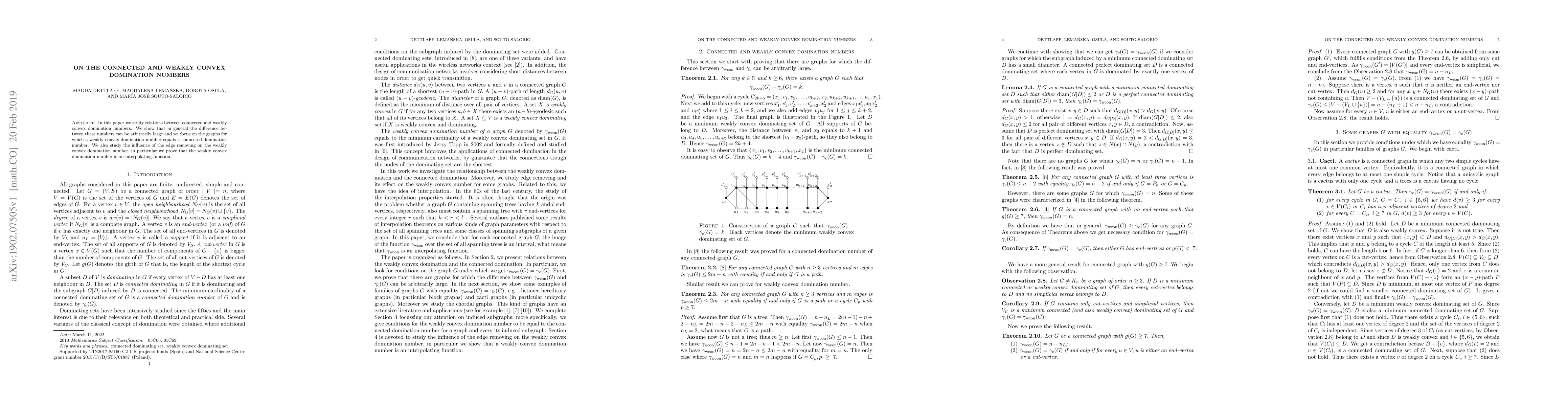 This paper explores the relationship between connected and weakly convex domination numbers in graphs, demonstrating that their difference can be significant. It identifies specific graph types where these numbers coincide and investigates how edge removal affects the weakly convex domination number, proving it to be an interpolating function.