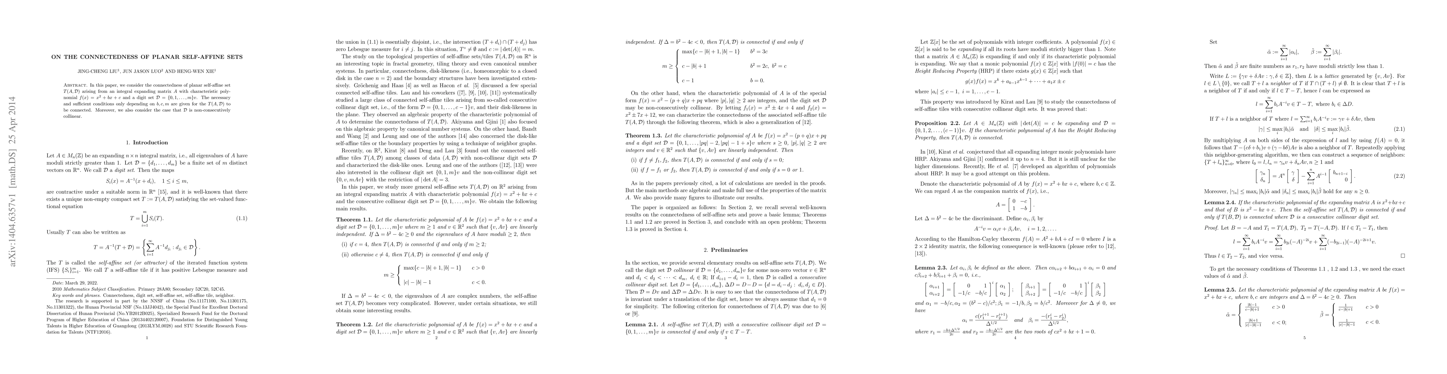 This paper provides necessary and sufficient conditions for the connectedness of planar self-affine sets $T(A,\mathcal{D})$, determined solely by parameters $b$, $c$, and $m$. It also examines cases where the digit set $\mathcal{D}$ is non-consecutively collinear.