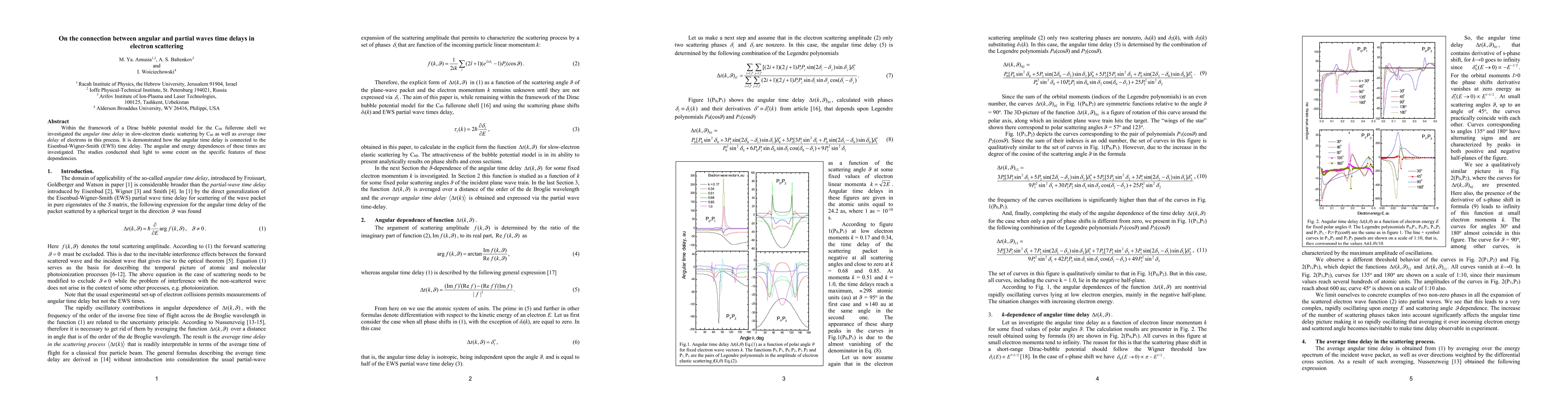 Within the framework of a Dirac bubble potential model for the C60 fullerene shell we investigated the angular time delay in slow-electron elastic scattering by C60 as well as average time delay of electrons in this process. It is demonstrated how the angular time delay is connected to the Eisenbud-Wigner-Smith (EWS) time delay. The angular and energy dependences of these times are investigated. The studies conducted shed light to some extent on the specific features of these dependencies.