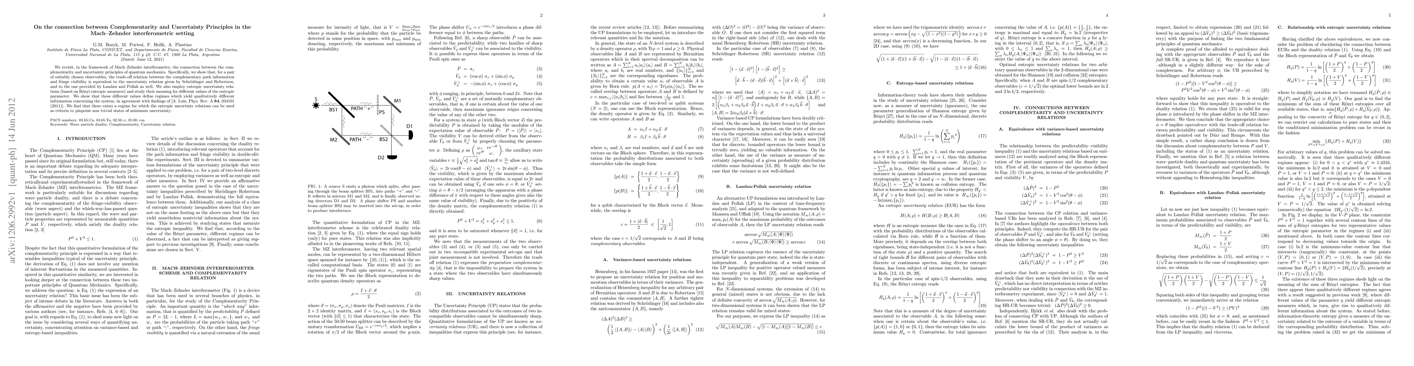 The paper establishes equivalences between complementarity and uncertainty relations, including variance-based and Landau-Pollak formulations, and analyzes entropic uncertainty relations in the context of Mach-Zehnder interferometry.