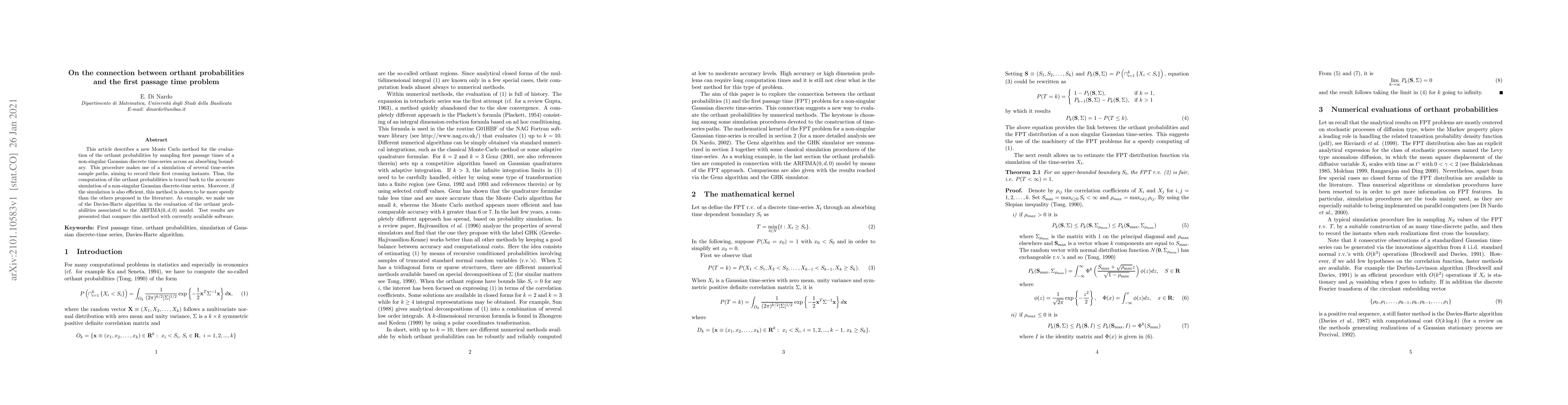 This paper introduces a Monte Carlo method for evaluating orthant probabilities by simulating first passage times of a non-singular Gaussian discrete time-series. The method is shown to be faster than existing techniques and is demonstrated using the Davies-Harte algorithm for the ARFIMA$(0,d,0)$ model.