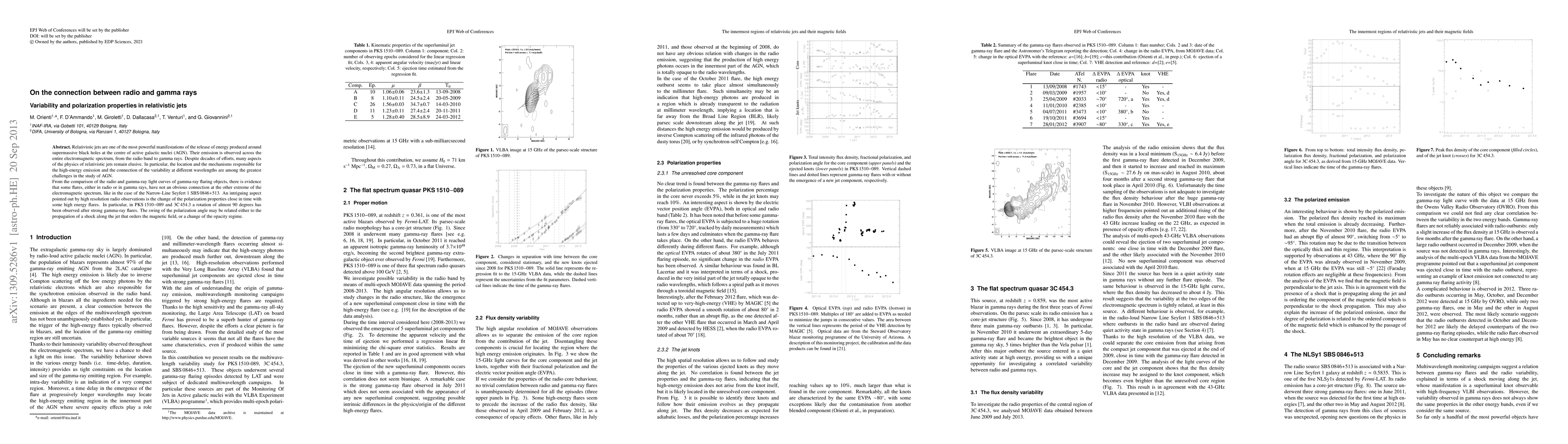 Relativistic jets are one of the most powerful manifestations of the release of energy produced around supermassive black holes at the centre of active galactic nuclei (AGN). Their emission is observed across the entire electromagnetic spectrum, from the radio band to gamma rays. Despite decades of efforts, many aspects of the physics of relativistic jets remain elusive. In particular, the location and the mechanisms responsible for the high-energy emission and the connection of the variability at different wavelengths are among the greatest challenges in the study of AGN. From the comparison of the radio and gamma-ray light curves of gamma-ray flaring objects, there is evidence that some flares, either in radio or in gamma rays, have not an obvious connection at the other extreme of the electromagnetic spectrum, like in the case of the Narrow-Line Seyfert 1 SBS 0846+513. An intriguing aspect pointed out by high resolution radio observations is the change of the polarization properties close in time with some high energy flares. In particular, in PKS 1510-089 and 3C 454.3 a rotation of almost 90 degrees has been observed after strong gamma-ray flares. The swing of the polarization angle may be related either to the propagation of a shock along the jet that orders the magnetic field, or a change of the opacity regime.