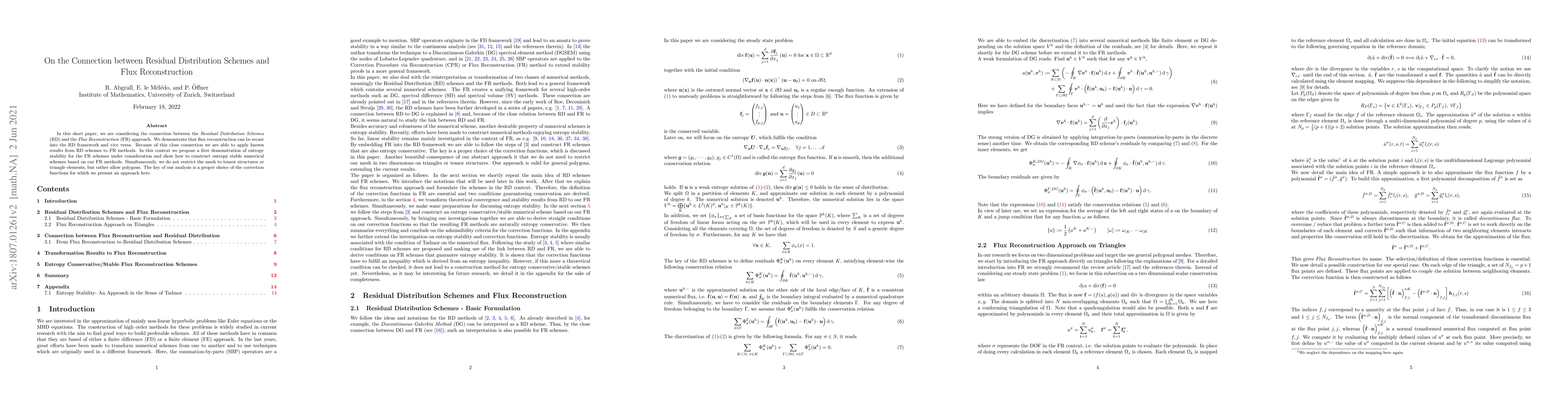 This paper explores the relationship between Residual Distribution Schemes (RD) and Flux Reconstruction (FR) approaches, demonstrating their equivalence and enabling the application of RD results to FR methods. It proposes a method for constructing entropy stable FR schemes, applicable to non-tensor mesh structures and polygon elements.