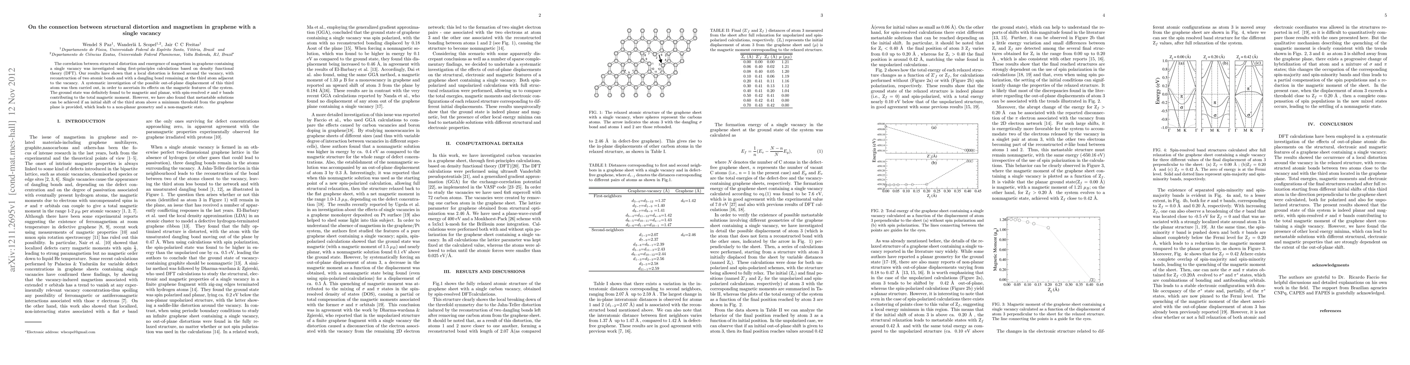 The study investigates the interplay between structural distortion and magnetism in graphene with a single vacancy using DFT calculations, revealing that local distortion and bond reconstruction lead to a magnetic ground state. Metastable, non-magnetic states can emerge with sufficient out-of-plane displacement of the third adjacent atom.