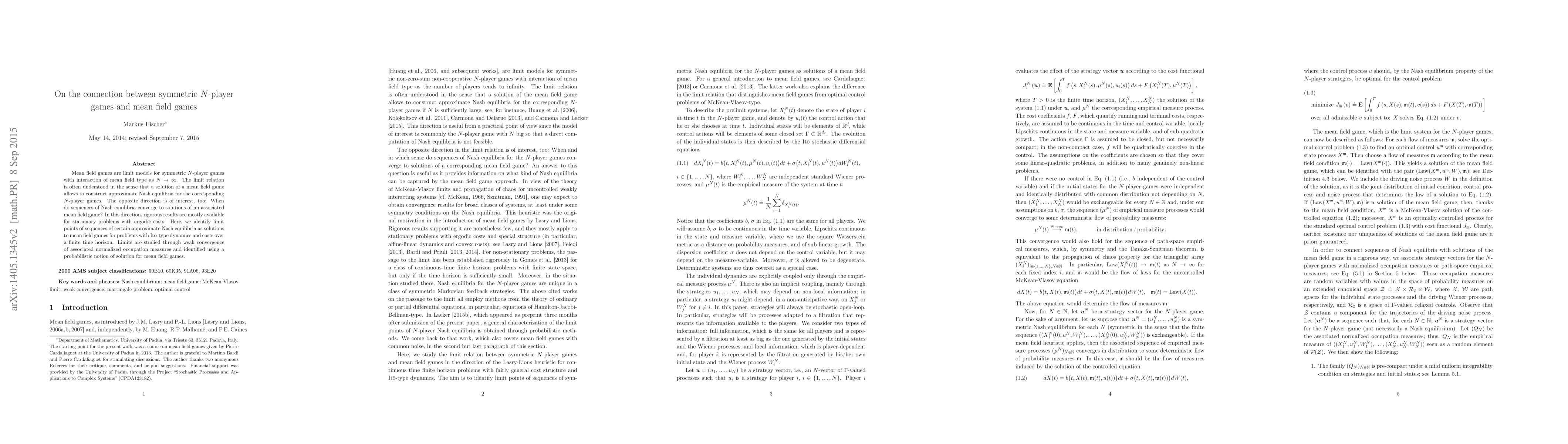 This paper explores the connection between symmetric $N$-player games and mean field games, demonstrating how solutions to mean field games can approximate Nash equilibria in large $N$-player games. It also investigates the convergence of sequences of Nash equilibria to solutions of mean field games under Itô-type dynamics and finite time horizon costs, using weak convergence of normalized occupation measures.