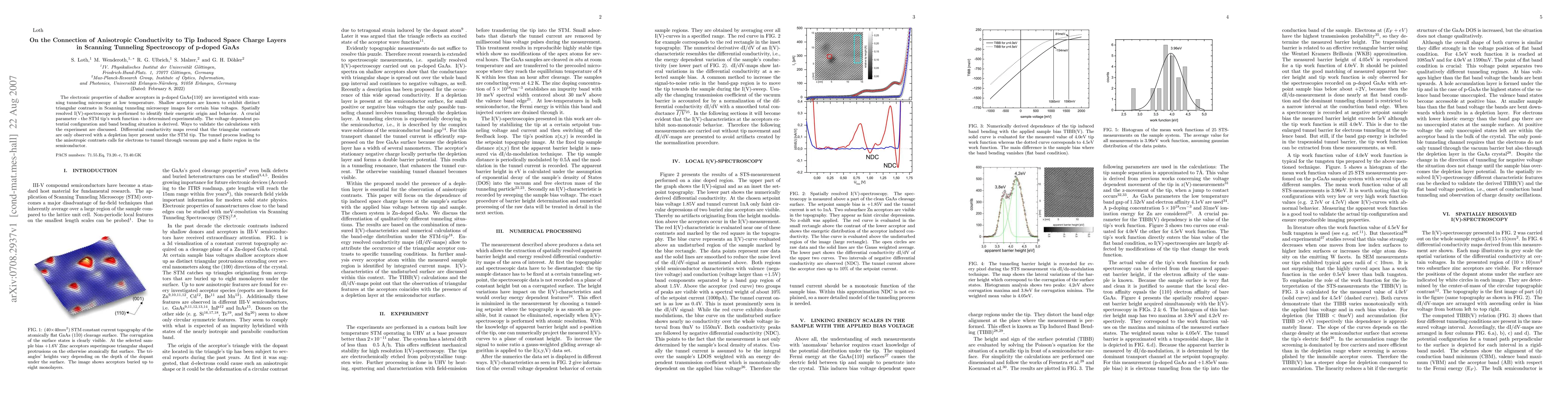 The electronic properties of shallow acceptors in p-doped GaAs{110} are investigated with scanning tunneling microscopy at low temperature. Shallow acceptors are known to exhibit distinct triangular contrasts in STM images for certain bias voltages. Spatially resolved I(V)-spectroscopy is performed to identify their energetic origin and behavior. A crucial parameter - the STM tip's work function - is determined experimentally. The voltage dependent potential configuration and band bending situation is derived. Ways to validate the calculations with the experiment are discussed. Differential conductivity maps reveal that the triangular contrasts are only observed with a depletion layer present under the STM tip. The tunnel process leading to the anisotropic contrasts calls for electrons to tunnel through vacuum gap and a finite region in the semiconductor.