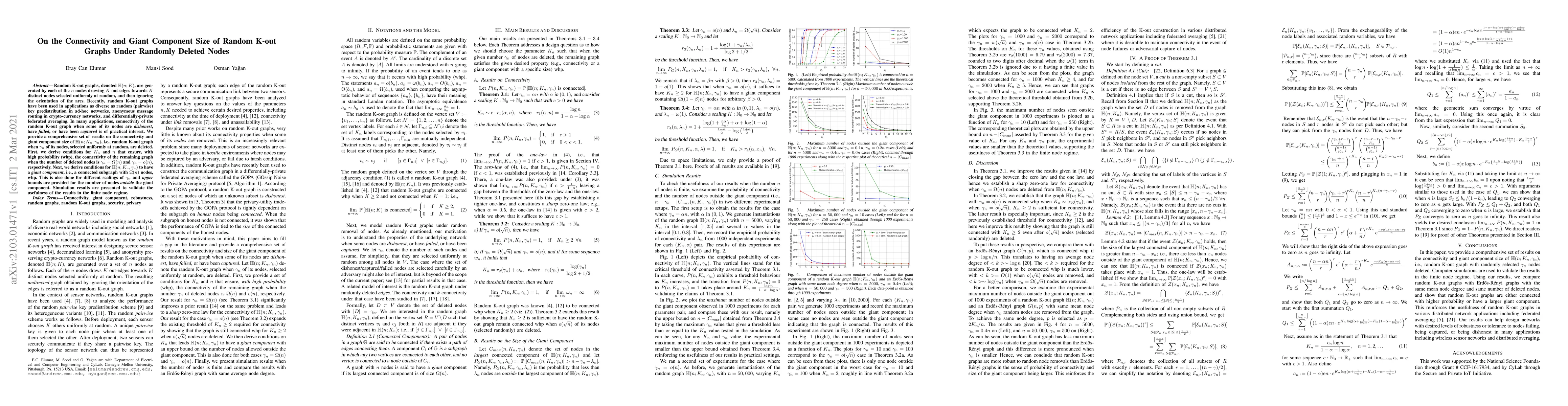 This paper investigates the connectivity and giant component size of random K-out graphs $\mathbb{H}(n;K_n,\gamma_n)$ after randomly deleting $\gamma_n$ nodes. It provides conditions for connectivity and the existence of a giant component under different scalings of $\gamma_n$, and validates the findings through simulations.
